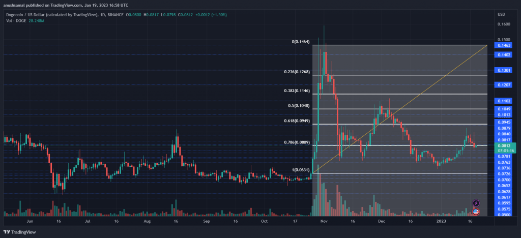 Dogecoin started losing value as soon as it fell outside its ascending parallel channel. At the moment, Dogecoin is trading laterally. Over the last 24 hours, DOGE went up by 0.3%, which confirms that the coin was stuck in a consolidated price region. Last week, Dogecoin brought in close to 4% gains. The technical outlook for the Dogecoin price depicted that bearish momentum had set in. Demand and accumulation for the meme-coin depreciated when it started to trade sideways. Related Reading: Tezos Approaches The ‘Mumbai Upgrade’, What’s Next For XTZ? The meme coin noted a price pullback after it breached the $0.88 resistance level. Over the last few days, Dogecoin has witnessed a substantial influx of buyers; however, selling pressure has amplified at press time. Overall, the meme coin has a bullish structure as it has managed to keep its price above the 200-Simple Moving Average line. In the shorter time frame, Dogecoin might retrace close to the $0.74 level before recovering or falling in value further. The market capitalization of DOGE declined slightly, indicating that selling pressure has mounted on the chart. Dogecoin Price Analysis: One-Day Chart DOGE was trading at $0.81 at the time of writing. The coin corrected itself after it reached the $0.88 price level. Immediate resistance for the meme coin stood at $0.87, close to the 61.8% Fibonacci retracement level. Moving past the $0.87 mark can push DOGE to the $0.104 resistance mark. On the other hand, if Dogecoin fails to stay above the $0.74 support level, it can fall to $0.66. If demand picks up slightly, it is unlikely that Dogecoin will fall below the $0.74 price floor. The amount of Dogecoin traded in the last session decreased, indicating that there has been a fall in buying pressure. Technical Analysis The meme coin has depicted a fall in demand as buyers started to decline on the daily chart. The Relative Strength Index (RSI) retraced after it stood close to the 70-mark, signifying excess buyers over sellers. This signified that the meme coin was correcting itself at press time. The RSI, however, remained above the 50-mark, indicating that buying strength was greater than selling strength. Dogecoin price was above the 20-Simple Moving Average (SMA), indicating that buyers were in control of price momentum in the market. It was also above the 50-SMA (yellow) and 200-SMA (green) lines, indicating bullishness. The coin, however, formed a death cross where the 200-SMA line crossed over the 20-SMA line. A death cross is accompanied by a significant fall in value. The meme-coin continued to display buy signals on the one-day chart. The Moving Average Convergence Divergence, which indicates price momentum and trend reversal, depicted green signal bars tied to buy signals. Related Reading: Bitcoin Bulls Hold The Line At $20,700, But Bigger Losses Are Imminent? These green histograms were shrinking, indicating that it was probably not a good time to buy the asset. In resonance with the same, the Bollinger Bands that suggest volatility widened apart, implying that the price would significantly change over the next trading session. Featured Image From UnSplash, Charts From TradingView.com