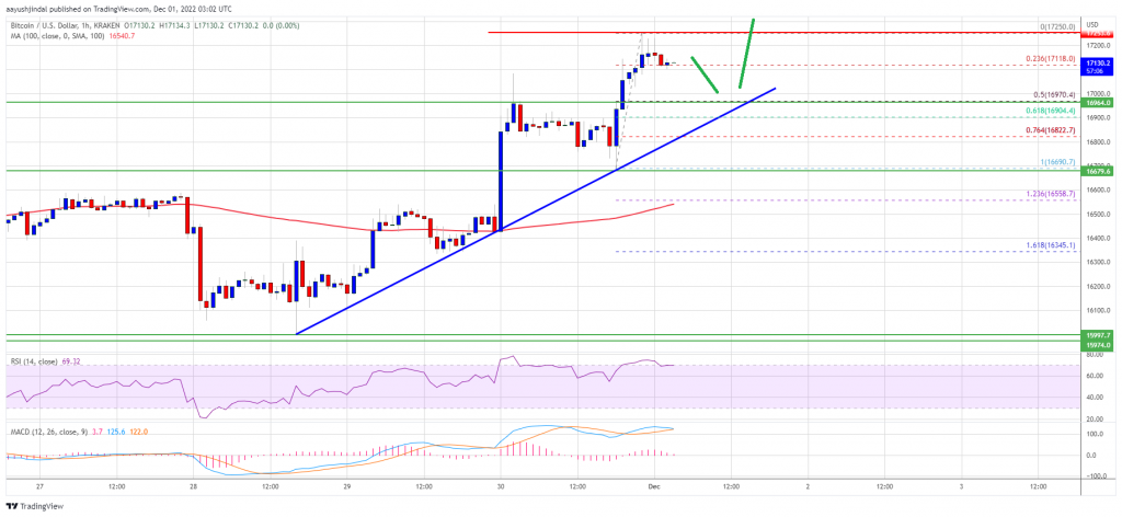 Bitcoin price was able to clear the $17,000 resistance. BTC is consolidating gains and might remain supported above the $16,750 level. Bitcoin gained pace and cleared the $16,800 and $17,000 resistance levels. The price is trading above $16,800 and the 100 hourly simple moving average. There is a key bullish trend line forming with support near $16,950 on the hourly chart of the BTC/USD pair (data feed from Kraken). The pair could rise further if it stays above the $16,500 support zone. Bitcoin Price Extends Gains Bitcoin price remained well bid above the $16,500 support zone. BTC gained pace and was able to clear the $16,800 resistance zone plus the 100 hourly simple moving average. The upward move was such that the price even surpassed the $17,000 resistance zone. It traded as high as $17,250 before the bulls faced sellers. It is now consolidating gains above the $17,000 level. The price is trading near the 23.6% Fib retracement level of the upward move from the $16,690 swing low to $17,250 high. Bitcoin price is now trading above $16,800 and the 100 hourly simple moving average. There is also a key bullish trend line forming with support near $16,950 on the hourly chart of the BTC/USD pair. On the upside, an immediate resistance is near the $17,950 level. The first major resistance is near the $17,500 zone, above which the price may perhaps start another steady increase. In the stated case, the price could rise towards the $18,000 resistance. Source: BTCUSD on TradingView.com The next major resistance is near $18,800, above which the price could gain pace for a move towards the $19,500 zone in the near term. Dips Limited in BTC? If bitcoin fails to climb above the $17,250 resistance, there could be a downside correction. An immediate support on the downside is near the $17,000 level. The next major support is near the $16,950 zone and the trend line. The trend line is close to the 50% Fib retracement level of the upward move from the $16,690 swing low to $17,250 high. A downside break below the trend line might call for a move towards $16,800. Any more losses might call for a test of the key $16,500 support zone in the near term. Technical indicators: Hourly MACD – The MACD is now losing pace in the bullish zone. Hourly RSI (Relative Strength Index) – The RSI for BTC/USD is now above the 50 level. Major Support Levels – $16,950, followed by $16,800. Major Resistance Levels – $17,250, $17,500 and $18,000.