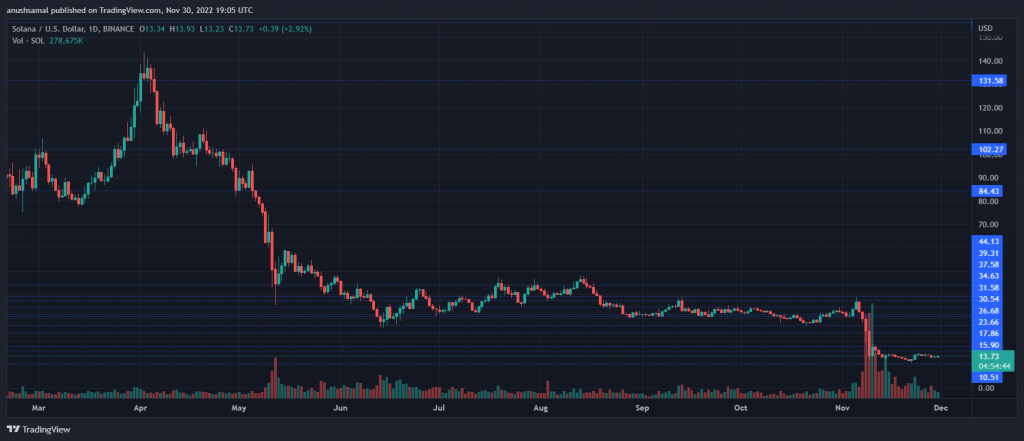 After a period of sluggish price action, the price of Solana has finally made a significant recovery on the chart. In the last week, the coin has surged over 9%. Although SOL might be moving up slowly, from a technical standpoint, the altcoin has recovered and might stage a rally in the upcoming trading sessions. Buyers were gradually re-entering the market, indicating that SOL registered accumulation. However, capital inflows remained low. With consistent upward price action, capital inflow will also register a positive change. Now that SOL has made small gains each day, the next resistance mark for the coin stands at $15. If Solana’s price breaks past $15, the coin can rally to $18. Although the Solana price has shown signs of recovery, it is still too early to say if the coin has gotten out of the woods. One push from the bears will bring SOL down to its closest support level. Related Reading: Bitcoin Bearish Signal: NVT Golden Cross Enters Sell Zone Solana Price Analysis: One-Day Chart SOL was trading at $13.73 at the time of writing. At the moment, SOL was resting above the $13 support line. There needs to be support from buyers and the broader market for Solana to topple above the $14 price mark. The aforementioned price ceiling should not be too difficult to surpass, given that the altcoin has been trading quite close to that level. On the other hand, the first support for Solana’s price was $13. Failing to remain above that will bring the coin down to $10.50. The amount of Solana traded in the past session was green, depicting a bullish preference. Technical Analysis SOL had witnessed quite the plunge in the month of November. The altcoin entered the oversold region twice this month. At press time, however, Solana had portrayed an increase in demand. The Relative Strength Index noted an uptick and inched closer to the 40-mark. This reading denoted a rise in accumulation. Solana’s price was also above the 20-Simple Moving Average line, which indicated bullishness and that buyers would drive the price momentum in the market. In terms of institutional interest, SOL has registered mundane performance for months. Despite the chart’s recovery, SOL’s capital inflows have remained low, mostly due to the broader market’s weakness. The Chaikin Money Flow (CMF) indicated capital inflows and outflows. CMF was below the half-line, indicating that outflows were greater than inflows. The Awesome Oscillator (AO) displays the trend and price momentum. AO was positive with green signal bars, which were tied to the buy signal for the altcoin. This also suggested further gains for Solana investors. Related Reading: Where Is The Ethereum Price Headed Next After Clearing This Resistance Featured image from Mudrex, Chart: TradingView.com
