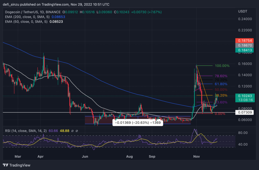DOGE’s price remains bullish as price holds above $0.1 Price remains strong as bulls dominate the market; the price aims for a rally toward $0.15 DOGE’s price trades above the daily 50 and 200 Exponential Moving Averages (EMA) The price action displayed by Dogecoin (DOGE) has been a show to watch, outperforming the likes of Ethereum (ETH) and Bitcoin (BTC) in recent days. In the high timeframe, the price of Dogecoin (DOG) looks strong, with a probable result of an uptrend movement if the market remains optimistic. Despite the relief bounce and uncertainty surrounding the crypto market, the FTX fiasco continues to act as a catalyst for the market to bottom out. The Domino effect of the FTX saga and other large investors has stalled the market, as it has yet to make a significant move, raising concerns about the market’s direction. (Data from Binance) Related Reading: Historic Bitcoin Miner Capitulation In Full Effect – How Long Will It Last? Dogecoin (DOGE) Price Analysis On The Weekly Chart Despite the relief bounce across the market, with the price of DOGE rallying from a weekly low of $0.08 to a high of $0.104, the crypto market remains uncertain and turbulent, affecting the price of DOGE. With so much news of a capitulation imminent for all crypto assets coupled with the FTX and other crypto projects suffering from bankruptcy, the bottom could be in soon. DOGE’s price had a weekly close below a crucial area of $0.09 after showing so much strength rallying from a weekly low of $0.08 to a high of $0.088 as the price was unable to break above $0.15. With the price of DOGE looking bullish on a low timeframe, the price could rally to a high of $0.15 if the market regains its relief bounce. Weekly resistance for the price of DOGE – $0.15. Weekly support for the price of DOGE – $0.09. Price Analysis Of DOGE On The Daily (1D) Chart The price of DOGE remains considerably strong in the daily timeframe after closing above $0.088. With DOGE’s price aiming to break past the region of $0.12, we could see more price rally to a high of $0.15. DOGE’s price currently trades at $0.12 above the 50 and 200 EMA, supporting the price of DOGE from dropping lower to $0.09. If the price of DOGE breaks and holds above the 38.2% Fibonacci level, we could see more price rally for DOGE price, signaling more buy orders and bulls in control. If DOGE’s price fails to flip, the region of $0.11 corresponds to 50% of the Fib value; we could see the price retesting $0.1 or lower depending on market sentiment. Daily resistance for the DOGE price – $0.12. Daily support for the DOGE price – $0.09. Related Reading: Bitcoin Price Looks Ready For Another Leg Higher Over $16.5K Featured Image From zipmex, Charts From Tradingview