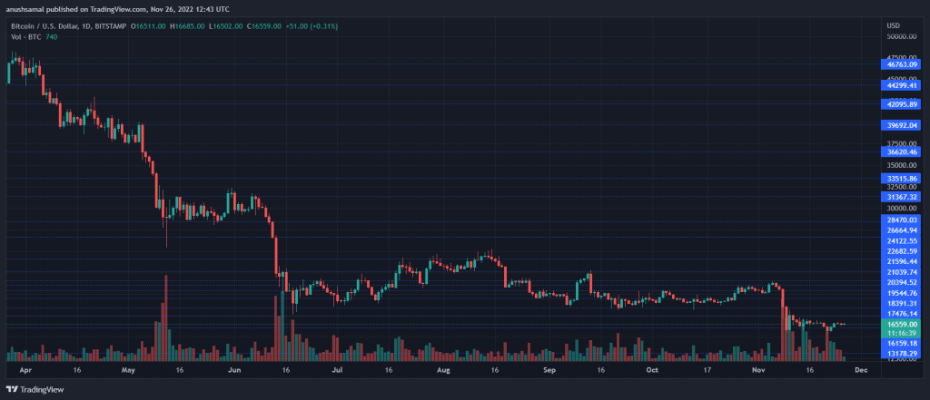 Bitcoin price bounced off the $15,400 price level and staged a recovery over the past day. In the last 24 hours, BTC has been moving sideways after claiming the $16,000 price mark. Since the coin is trading sideways at the moment after the recovery, Bitcoin awaits a breakout. The coin will have to move above the $16,600 mark in order for the bears to be invalidated. Now that Bitcoin is closer to the aforementioned price resistance mark, there could be a chance for BTC to move to the $17,000 price zone. Buyers need to step up in order for the coin to move above the $16,600 price mark. The coin’s technical outlook confirms that it is trending upward on its chart. The buying strength has, however, remained low despite an uptick on the one-day chart. Related Reading: Dogecoin Rallies As Price Breaks Major Resistance; Here Is Why $0.15 Is Possible Bitcoin Price Analysis: One-Day Chart BTC was trading at $16,500 at the time of writing. After Bitcoin broke past the $15,400 price level, the coin registered positive buying action. This has contributed to the coin’s price rising above the $16,000 mark. The crucial price zone remains at $16,500, and a move above it will be a point of bullish momentum for Bitcoin. BTC’s overhead resistance was at $17,000, and a move above that could halt bulls at $17,600. BTC will reach a psychological level of $18,000 if it rises above $17,600. The amount of BTC traded in the previous session was green, indicating accumulation. Technical Analysis The coin had recently visited the oversold zone in the middle of this month, and the move above the $15,400 mark had caused buyers to regain confidence in the asset. At the time of writing, BTC registered demand on the one-day chart. The Relative Strength Index was moving above the 40-mark as demand for the coin returned to the market. If demand remains consistent, a move above $17,000 would happen over the next trading session. Bitcoin can jump above the 20-Simple Moving Average if the coin crosses the $16,700 price mark. At the moment, BTC was below the 20-SMA. This indicated that sellers were still driving the price momentum in the market. In correspondence to the buying strength, BTC also depicted the start of the buy signal for the coin. The Moving Average Convergence Divergence indicates price momentum and trend change. MACD displayed green signal bars, which are tied to the buy signal for BTC. In anticipation of rangebound movement, the Bollinger Bands, which indicate price fluctuation, narrowed. A rise in demand will help bulls gain strength and break past the current trading range. Related Reading: Chainlink Extends Accumulation By 200 Days; Will Bulls Push For A Breakout? Featured Image From UnSplash, Charts From TradingView