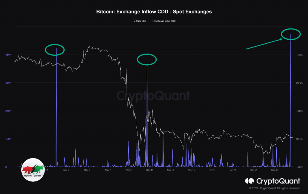 On-chain data shows Bitcoin long-term holders have ramped up their selling recently, something that could lead to further plunge in the crypto’s price. Bitcoin Exchange Inflow CDD Has Spiked Up Over The Last Day As pointed out by an analyst in a CryptoQuant post, the current rise in the CDD is the largest since 6th October. A “Coin Day” is the quantity that 1 BTC accumulates after staying still for 1 day in a single address. If a coin that has amassed some number of Coin Days finally moves to another wallet, its Coin Days counter resets, and the Coin Days are said to be “destroyed.” The “Coin Days Destroyed” (CDD) metric keeps note of the total number of such Coin Days being destroyed throughout the network on any given day. Another version of this indicator is the “exchange inflow CDD,” which measures only those Coin Days that were reset because of transactions to centralized exchanges. Now, here is a chart that shows the trend in the Bitcoin exchange inflow CDD over the past month: The value of the metric seems to have spiked up during the last day or so | Source: CryptoQuant As you can see in the above graph, the Bitcoin exchange inflow CDD has shown a sharp rise in its value recently. There is a cohort in the BTC market called the “long-term holder” (LTH) group, which includes all investors who hold onto their coins for long periods without moving them. Related Reading: Bitcoin Capitulation Deepens As aSOPR Metric Plunges To Dec 2018 Lows Because of the dormancy of their coins, thes LTHs accumulate a large numbers of Coin Days. As such, whenever these holders do move their coins, the CDD usually spikes up due to the scale of Coin Days involved. The current spike in the Bitcoin exchange inflow CDD thus suggests that some LTHs have deposited their coins to exchange wallets. As the exchanges in question are spot platforms, it’s possible that this movement of coins was made for selling purposes. Related Reading: Bitcoin Shakes Off the Bears and Aims for $20,000 By End Of Year, Can It Make It? From the graph, it’s apparent that both the previous big spikes in the indicator were followed by declines in the price of Bitcoin. If the latest surge was also because of LTHs preparing to dump their coins, then the crypto is likely to observe bearish trend this time as well. BTC Price At the time of writing, Bitcoin’s price floats around $16.4k, down 2% in the last week. Over the past month, the crypto has lost 15% in value. Looks like the price of the coin has been back to moving sideways in the last few days | Source: BTCUSD on TradingView Featured image from Zdeněk Macháček on Unsplash.com, charts from TradingView.com, CryptoQuant.com