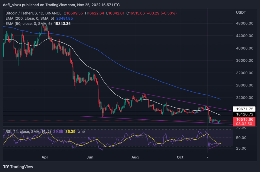BTC’s price is rejected from breaking above $16,700 as this region is too strong for bulls. BTC’s price remains bearish in the high timeframe as most traders and investors remain cautious. BTC’s price bounces from a low of $15,500 on the daily timeframe as the price reclaims $16,500 as price struggles to break higher above the 50 Exponential Moving Average (EMA) The price action demonstrated by Bitcoin (BTC) in recent times has been better than the previous week as the market suffered from some price decline affecting most crypto assets. Despite the relief bounce from Bitcoin (BTC), the price still trades below the key region of interest that would attract the attention of many buyers. The Domino effect of the FTX saga and other huge investors has left the market at a standstill as the market is yet to make a major move leading to much fear about where the market could be headed. (Data from Binance) Related Reading: Litecoin (LTC) Must Maintain $77 Level To Sustain Enthusiasm Come December Bitcoin (BTC) Price Analysis On The Weekly Chart Despite the uncertainty and turbulence that has affected the price of Bitcoin (BTC) and the crypto market at large, many altcoins are struggling for survival, trying to stay afloat as the prices of altcoins continue a downward price movement. Bitcoin (BTC) has suffered more price loss, as the price dropped from a high of $69,500 to a weekly low of $15,500, leading to speculation of a further drop to $12,000. BTC’s price declined from a weekly region of $20,500 to a region of $15,500 due to the FTX fiasco, as the price found minor support to hold the sell-off in price to a further weekly low. The price of BTC bounced off from $15,500, rallying to a high of $16,700, where the price faced rejection breaking higher. The price of BTC needs to hold above $16,000 to keep alive the hope of a relief bounce. Weekly resistance for the price of BTC – $18,500. Weekly support for the price of BTC – $15,500. Price Analysis Of BTC On The Daily (1D) Chart The price of BTC remains considerably strong in the daily timeframe as the price trades above $16,000 after BTC saw its price decline from $20,500 to $15,500 as the market continues in its state of uncertainty. BTC’s price continues to struggle as price aims for more relief bounce from this region. The price of BTC needs to reclaim and trade above $18,500 for a short-term relief bounce. If the price of BTC fails to flip the region of $17,500, we could see more rejection in BTC price to a region of $15,500 and even lower. Daily resistance for the BTC price – $17,500. Daily support for the BTC price – $15,500. Related Reading: Dogecoin Jumps 10% As Gokhshtein Claims Buterin And Musk Will Work Together For DOGE Featured Image From zipmex, Charts From Tradingview