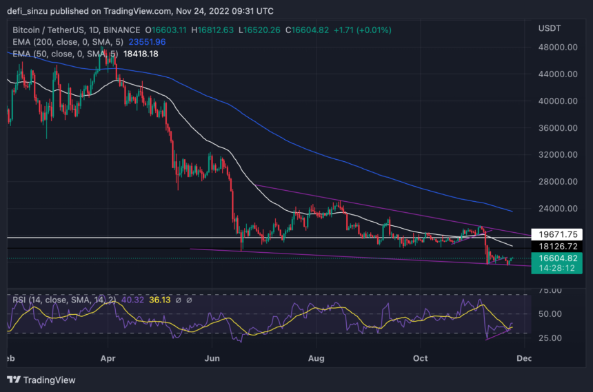 BTC’s price lost its all-time high of $18,000 as FTX fiascos continued to affect its price Price continues to look bearish with the market’s current state, as things look uncertain for most traders and investors BTC’s price bounces from a low of $15,500 on the daily timeframe as the price reclaims the 50 Exponential Moving Average (EMA) The past few days for Bitcoin (BTC) have been rosy, with the price rallying from a low of $15,500 to a high of $16,500, with altcoins enjoying some relief bounce across the crypto market. Despite the relief for the price of Bitcoin (BTC), the price still trades below its previous all-time high support of $18,000, which is a bit problematic considering this region now serves as resistance for a major rally. The Domino effect of the FTX saga and other huge investors has left the market at a standstill as the market is yet to make a major move leading to much fear about where the market could be headed. (Data from Binance) Related Reading: Bitcoin Price Prediction: Recovery Just Getting Started or It’s Bull Trap? Bitcoin (BTC) Price Analysis On The Weekly Chart The past few days have been filled with so much turbulence in the crypto space as many altcoins have struggled to show strength after losing their key support holding off price decline. The price of BTC suffered a decline in price to a region of $15,500, with many expecting the price to dump further to a region of $14,000 to $12,000 when the price bounced off from this region after forming a bullish pin bar as buyers pushed the price higher to a region of $16,500. BTC’s price needs to break above $18,500 for more signs of relief as this region has become key for better price action to a high of $19,500. Weekly resistance for the price of BTC – $18,500. Weekly support for the price of BTC – $15,500. Price Analysis Of BTC On The Daily (1D) Chart The price of BTC remains considerably strong in the daily timeframe as the price trades above $16,500 after a decline to a region of $15,500 due to the FTX fiasco. If the price of BTC breaks above $17,500, we could see more rallies for BTC price; a break below a region of $16,000 would be a bear trap as the price could go lower. The price of BTC trades below 50 and 200 EMA acting as resistance for the price of BTC to trend higher. The price of $18,500 and $23,500 corresponds to the price of 50 and 200 EMA that needs to be reclaimed for bulls to be safe from further downtrend by bears. Daily resistance for the BTC price – $17,500. Daily support for the BTC price – $16,500-$15,500. Related Reading: Ethereum Price Recovers But Bears Are Not Out Of The Woods Yet Featured Image From BusinessDay, Charts From Tradingview