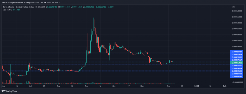 The LUNA Classic (LUNC) price has noted a fresh decline in the last 24 hours. In that time frame, the altcoin depreciated by 1%. In the past week, LUNC logged gains worth 2.5%. Much of the weekly gains have been lost due to losses on the daily chart. At the moment, LUNC depicts consolidation beneath its immediate resistance mark. With the FTX collapse, LUNC has been teetering under a bearish influence for quite some time. Over the last month, the coin has lost more than 10% of its market value. On the development front, there is a new update. This is the introduction of the new Alpha package for TerraDart. TerraDart is a Dart SDK that is used for writing applications that would be interacting with the Terra blockchain, which has launched a new package called Alpha. The Alpha package has been available to communicate with the LUNC blockchain within Flutter and Dart environments. Related Reading: Yearn Finance: What The Final Quarter Of 2022 Has In Store For YFI Price Luna Classic (LUNC) Price Analysis: One-Day Chart LUNC was exchanging hands at $0.000162 at press time. The altcoin just fell from $0.000170 due to intra-day losses. Even with developments in the ecosystem, the LUNC price remains largely unaltered. The rigid price ceiling was at $0.000175, but demand for the coin was too low for bulls to take charge. Once the altcoin topples above the $0.000175 mark, it will be an easy path to the psychological level of $0.00019. On the flip side, with lesser accumulation, LUNC would eye its closest support line of $0.000148. Falling through the $0.000148 mark will bring LUNC to $0.00012. The amount of LUNC traded in the last session was low, indicating bearish strength. Technical Analysis In the past month, the coin displayed a bullish divergence, after which LUNC noted a slight increase in price. Despite that, the bulls could not build on their strength. The Relative Strength Index was near the 40-mark, which meant that the coin was moving toward the oversold zone. Similarly, the LUNC price was below the 20-Simple Moving Average line, which denoted a lack of demand. The reading also indicates that sellers were driving the price momentum in the market. In regards to buying strength, capital inflows have also declined due to a lack of investor interest. The Chaikin Money Flow depicts capital inflows and outflows at a given point. The indicator was below the half-line which meant low capital inflows. Related Reading: Ethereum: On-Chain And Social Metrics Reveal Bulls Vs. Bears Battle – Who’s Winning? The Directional Movement Index indicates the general price direction and trend of the asset. DMI was negative as the -DI (orange) line was above the +DI (blue) line. The Average Directional Index (red) was below the 25 mark, indicating a loss of strength in the current price action. Presently, LUNC is trading at 100% lower than its all-time high secured approximately eight months ago. Featured image from Wccftech, Chart: TradingView.com
