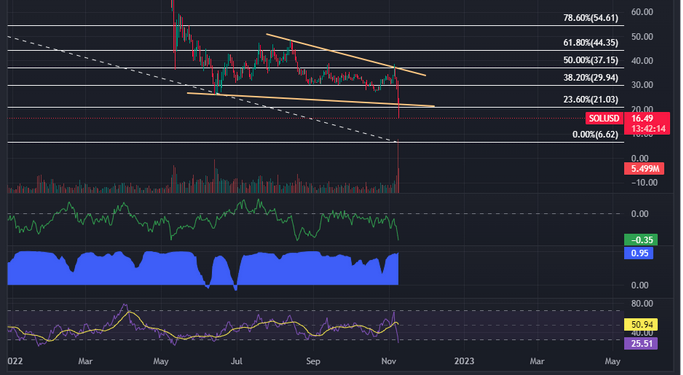After Binance and FTX engaged in a word war on social media – and eventually making amends (well, sort of; Binance said today it’s buying FTX) – Solana got dumped violently. Solana’s native token, SOL, is trading in the red across all time frames, as reported by CoinGecko, lending credence to the bearish claims. When asked what a Binance deal for FTX meant for Solana, Ran Neuner of CNBC Crypto Trader and founder of Crypto Banter referred to SOL’s pricing issues. In a tweet, he said: “Solana [is] getting killed.” He claims that the market has only recently realized that Binance CEO Changpeng Zhao “now owns 10% of the tokens and that he would prefer support the BNB chain than SOL.” This is a devastating blow to SOL investors and traders. November has gone down in history as one of the worst months ever for Solana investors. Solana getting killed. Market realizing that @cz_binance now owns 10% of the tokens and that he would rather support BNB chain than SOL. Also Solana just lost all the support and investment that FTX and @SBF_FTX were making in the ecosystem. — Ran Neuner (@cryptomanran) November 8, 2022 Based on figures by CoinMarketCap, the coin registered more than 20% in weekly decline. At Coingecko, SOL is down 37% in the last seven days. Chart: TradingView The Solana network did benefit from recent advancements on its network, but the market behavior of SOL over the past week has been very lackadaisical. Related Reading: Polygon Soars 13% In Last 7 Days As MATIC Bulls Work To Hit New Highs Negative Effects Of FTX On Solana In a related development, the FTX’s native token, FTT, has had its value drop across all time scales as well, and is currently trading at $4.058. Meanwhile, after being rejected at the $38.26 area, SOL is now trading in the red at the $17.52 range, reflecting the same downward shift, courtesy of the negative impact that FTT’s drop has brought along. Now, the charts also don’t look good for SOL buyers and sellers. A total turnaround of mood, as shown by the CMF signal, is only comparable to the market crash that occurred when Terra pulled the crypto market down. Image: The Independent Investors and traders are also receiving significant bear market indications from the RSI, making the current market environment considerably more precarious. Despite this, the crypto community is still on the fence regarding a bullish reversal as the crypto market cap plummeted after BTC and other tokens fell due to the FTX brouhaha. What Can Still Be Done As the coin is currently in freefall, SOL bulls can position themselves at the 23.60 Fibonacci retracement level, which can serve as a launchpad for a possible relief rally in the near future. However, even this potential support may remain hypothetical in the face of the ongoing drama between FTX and Binance. With the decline of the cryptocurrency market, all we can do is hope. The latest price crunch is fueled in part by a high institutional fear that another LUNA implosion might occur, and current investor sentiment reflects this anxiety in the form of panic selling on the cryptocurrency market, which exerts more downward pressure on SOL. As of this writing, SOL is trading at a new low of $16.55, which does not bode well for the coin’s investors and traders. If the opportunity presents itself, however, investors and traders can purchase the dip and potentially halt the current market decline. Related Reading: Ethereum Loses $1,500 Grip As ETH Heads Down To Correction Phase SOL total market cap at $7.18 billion on the daily chart | Featured image from NBC News, Chart: TradingView.com