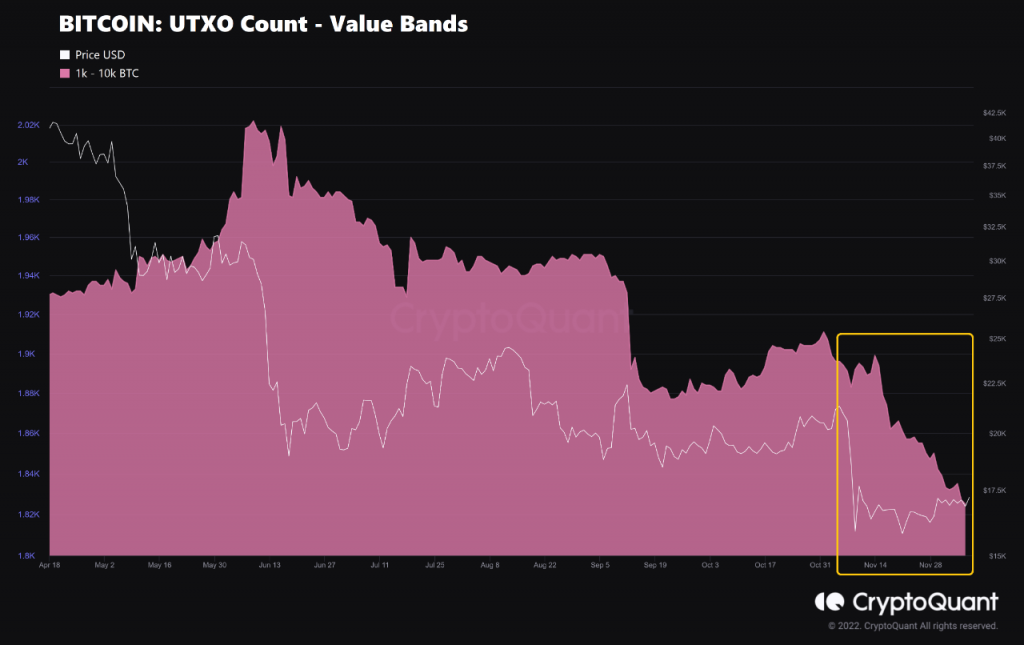 On-chain data shows Bitcoin whales have continued to shave off their holdings in recent weeks, suggesting that the current lows may not be attractive enough to them. Bitcoin Whales Continue To Sell Despite The Recent Deep Lows As pointed out by an analyst in a CryptoQuant post, the number of investors with balances in the 1k to 10k BTC range have continued to decline recently. The relevant indicator here is the “UTXO Count – Value Bands,” which tells us about the number of UTXOs (or wallets) that are currently in each Bitcoin value band. These value bands are groups that define ranges between which the balances of UTXOs falling into said bands lie. For example, the 100-1k BTC value band includes all UTXOs (or wallets) that currently have between 100 and 1,000 coins. Related Reading: Ethereum Bullish Signal: Whales And Sharks Continue To Add To Their Holdings The value band of interest in the current context is the “1k-10k BTC” group. Here is a chart that shows how the UTXO Count of this value band has changed over the last several months: Looks like the value of the metric has taken a hit in recent days | Source: CryptoQuant As you can see in the above graph, the Bitcoin UTXO Count for the 1k-10k BTC value band has observed some steep decline over the past month. Wallets with such large balances usually belong to the whales. This means that the holdings of these humongous holders have gone down in this period. This entire latest decline has come following the crash caused by crypto exchange’s FTX collapse, which means whales have sold their coins while the prices have been hitting lows. Related Reading: Is Bitcoin Bottom In? This On-Chain Condition Hasn’t Been Met Yet Historically, whales have shown accumulation behavior as bear markets have bottomed out. But recently instead of seeing an increase or even sideways movement, the UTXO Count of this whale value band has been strangely decreasing. This trend could be a sign that whales are still not finding the current lows attractive enough to buy more, and that they may rather be selling off their reserves as they expect the bearish winds to continue further. BTC Price At the time of writing, Bitcoin’s price floats around $17.2k, up 1% in the last week. Over the past month, the crypto has lost 7% in value. Below is a chart that shows the trend in the price of the coin over the last five days. The value of the crypto seems to have seen some rise during the past day | Source: BTCUSD on TradingView Bitcoin has been stuck moving sideways around the $17k level recently, but at the moment it’s unclear when some real volatility may return to the crypto. Featured image from Thomas Lipke on Unsplash.com, charts from TradingView.com, CryptoQuant.com