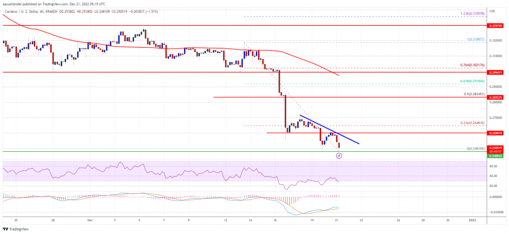 Cardano’s price started a fresh decline after it failed to surpass $0.32. ADA remains at a risk of more losses below $0.25 and $0.245 in the near term. ADA price is gaining bearish momentum below the $0.280 support against the US dollar. The price is trading below $0.280 and the 100 simple moving average (4-hours). There is a key bearish trend line forming with resistance near $0.2560 on the 4-hours chart of the ADA/USD pair (data source from Kraken). The pair could continue to move down below the $0.245 support zone. Cardano (ADA) Price Could Dive Further In the past few days, cardano’s price saw a steady decline from the $0.320 resistance zone. The bears were able to push the price below the $0.30 and $0.280 support levels. The decline gained pace below the $0.265 level and the 100 simple moving average (4-hours). ADA price even spiked below the $0.250 support zone and traded as low as $0.2481. It is now showing a lot of bearish signs near the $0.250 zone, unlike bitcoin and ethereum. It is trading well below $0.280 and the 100 simple moving average (4-hours). On the upside, an immediate resistance is near the $0.255 zone. There is also a key bearish trend line forming with resistance near $0.2560 on the 4-hours chart of the ADA/USD pair. The first major resistance is forming near the $0.264 zone. It is near the 23.6% Fib retracement level of the downward move from the $0.3188 swing high to $0.2481 low. Source: ADAUSD on TradingView.com The main resistance is now forming near the $0.2840 level. It coincides with the 50% Fib retracement level of the downward move from the $0.3188 swing high to $0.2481 low. If there is an upside break above the $0.280 and $0.284 resistance levels, the price could start a strong increase. In the stated case, the price could rise steadily towards the $0.32 level. More Losses? If cardano’s price fails to recover above the $0.255 and $0.264 resistance levels, it could continue to move down. An immediate support on the downside is near the $0.248 level. The next major support is near the $0.245 level. A downside break below the $0.245 level could open the doors for a fresh decline towards $0.220 in the coming days. The next major support is near the $0.200 level. Technical Indicators 4-hours MACD – The MACD for ADA/USD is gaining momentum in the bearish zone. 4-hours RSI (Relative Strength Index) – The RSI for ADA/USD is now below the 50 level. Major Support Levels – $0.245, $0.220 and $0.200. Major Resistance Levels – $0.255, $0.264 and $0.284.