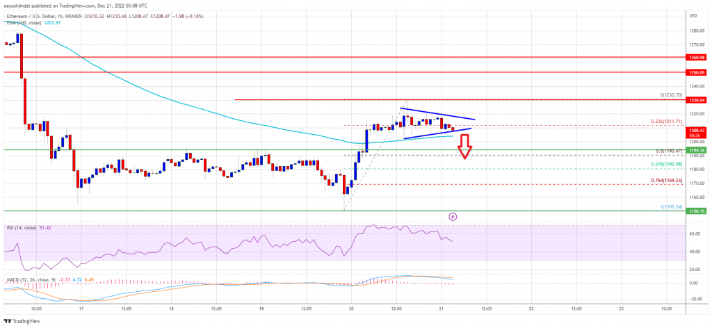Ethereum is facing resistance above $1,220 against the US Dollar. ETH could start another decline if it fails to stay above $1,200 and the 100 hourly SMA. Ethereum started an upside correction above the $1,180 resistance zone. The price is now trading above $1,200 and the 100 hourly simple moving average. There is a short-term contracting triangle with resistance near $1,220 on the hourly chart of ETH/USD (data feed via Kraken). The pair could start another upward move if there is a wave above the $1,220 resistance. Ethereum Price Eyes Recovery Ethereum price found support near the $1,150 zone and started a recovery wave. ETH was able to clear the $1,180 and $1,190 levels. The price even climbed above the $1,200 level and the 100 hourly simple moving average, similar to bitcoin. A high was formed near $1,230 before the price started a consolidation phase. Ether price is now trading near the 23.6% Fib retracement level of the recent increase from the $1,150 swing low to $1,230 high. The price is now trading above $1,200 and the 100 hourly simple moving average. There is also a short-term contracting triangle with resistance near $1,220 on the hourly chart of ETH/USD. The first major resistance is near the $1,220 level. Source: ETHUSD on TradingView.com A clear upside break above the $1,220 resistance and then a move above the $1,230 level could initiate a decent increase. The next major resistance could be $1,260. If the bulls clear the $1,260 resistance, the price might rise towards $1,300. Any more gains might send the price towards the $1,350 resistance zone. An intermediate resistance could be near the $1,320 level. Fresh Drop in ETH? If ethereum fails to climb above the $1,220 resistance, it could start another bearish wave. An initial support on the downside is near the $1,200 level. The next major support is near the $1,190 level or the 50% Fib retracement level of the recent increase from the $1,150 swing low to $1,230 high. A clear downside break below $1,190 might push the price lower towards the $1,150 support. Any more losses could lead the price towards the $1,100 support. Technical Indicators Hourly MACD – The MACD for ETH/USD is now losing momentum in the bullish zone. Hourly RSI – The RSI for ETH/USD is now above the 50 level. Major Support Level – $1,190 Major Resistance Level – $1,220