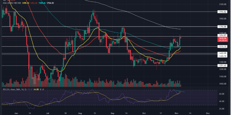 Ethereum is currently at the mercy of sellers that could put a huge dent on its bullish momentum and pull it back to the $1,500 region, or even lower. The king of all altcoins took advantage of the crypto market’s late October push, surging all the way to $1,655. It tried to move past this particular territory to be closer to its $1,700 target. ETH is steadily holding the $1,600 zone, for now Ethereum could retest the $1,500 support level due to tremendous selling pressure The altcoin is forecasted to trade below $1,400 30 days from now But the effects of the Federal Reserves’ 75 bps interest rate hike caught up with the cryptocurrency and made it fall all the way down to $1,500 once again. The digital asset was quick to shake this off and made a bounce back rally as it now trades at $1,615 according to latest data from Coingecko. In a span of two weeks, ETH managed to grow by 30% but if selling pressure continues to get in the way of the altcoin, it might kiss its entire recent gains goodbye. Sellers Could Push Ethereum To Test A Familiar Support Level As the crypto continues to hold the $1,600 marker, it will continue to attract sellers specially those who started to accumulate when ETH was struggling to even just hit the $1,400 zone. Related Reading: Dogecoin (DOGE) Price Seen Sliding 15% In Coming Days – Here’s Why Source: TradingView If indeed more selling pressure comes right now, the digital currency could decline by 7% and will visit a familiar territory – the $1,500 support level. This price dump will then put Ethereum in a double-top pattern which denotes an accelerated bearish cycle that will ultimately make the asset fall below the earlier mentioned support zone. It gets worse for ETH as its Relative Strength Index (RSI) is showing weakness in its previous bullish movement, seemingly affirming the bearish forecasts. Technical analysis points for the crypto show its current volatility level is low and therefore there is a possibility that any significant decline that will be observed from it right now could persist for a long time. Coincodex Sees The Same For Ethereum Coincodex, an online tracker and crypto data provider, is seeing the same bleak situation for the second largest cryptocurrency in terms of market capitalization. According to its forecast, over the next five days, ETH will trade at $1,533 as it will abandon the $1,600 region that it hit after responding positively to the October Labor Report of the U.S. The next 30 days will be worse for the crypto asset as it is predicted to drop below the $1,400 marker and will settle for a changing hands price of $1,357. It would appear that Ethereum’s only chance to avoid revisiting the mentioned price levels is if sellers are unable to exert strong pressure that could undermine its current bullish movement. Related Reading: Axie Infinity Can Recoup Its 6-Month Loss And Rise 25%, But It Must First Do This ETH market cap at $198.6 billion on the weekly chart | Featured image from Kryptomoney, Chart: TradingView.com Disclaimer: The analysis represents the author’s personal understanding of the crypto market and should not be construed as investment advice.