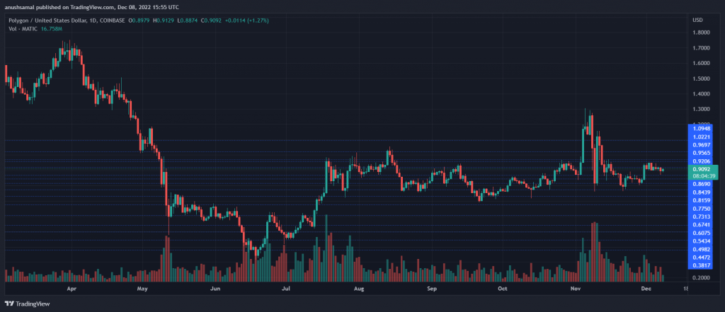 The Polygon (MATIC) price momentum registered a positive shift over the last 24 hours. The altcoin gained close to 3%. Meanwhile, on the weekly chart, MATIC is yet to recover from its losses. The technical outlook depicted positive price action; however, the coin is still not out of the woods. MATIC has to break past the immediate resistance zone and trade above the $1.30 mark for a significant period of time. The coin also formed a head and shoulder pattern, often connected to a downtrend. In the shorter time frame, MATIC might act bullish before it again starts to drop its value. The $1.30 mark remains crucial for the coin, as the bulls have barely traded above that mark. Before the coin gets to the $1 mark, the technical outlook forecasts another drop for the coin. This fall could bring the MATIC price to $0.70. The coin traded at a 68% discount to its all-time high in 2021. Related Reading: Bitcoin Whales Dump 20,000 BTC On The Market, Sell Side Strengthens MATIC Price Analysis: One-Day Chart Polygon (MATIC) was auctioned at $0.90 at press time. The altcoin has been struggling below $1, which has acted as a strong barrier for the altcoin. MATIC has established the $0.80 mark as the support line. The path to $1 will not be smooth for the MATIC price, as it has to encounter two other resistance levels of $0.92 and $0.97, respectively. Losing the $0.90 price level will bring the MATIC price down to $0.80 and then to $0.70 before recovering again. The amount of MATIC traded in the last session was green, which signified that buyers attempted to return to the market. Technical Analysis Buyer interest started to return in small proportions on the one-day chart. The Relative Strength Index remained slightly above the half-line, indicating demand for the altcoin. MATIC is still undervalued. Correspondingly, the MATIC price moved above the 20-Simple Moving Average line, which meant that the buyers were driving the price momentum in the market. The market outlook for MATIC indicates that the coin will soon fall below the 20-SMA line, bringing sellers into power. A small rise in buyers has indicated an increase in capital outflow for MATIC. The Chaikin Money Flow was above the half-line, which meant that inflows exceeded outflows. Moving Average Convergence Divergence indicates a reversal of momentum and trend. There was a bullish crossover, which was good news for buyers as that marked a buy signal for the altcoin. Only a move above $1 will stabilize buying strength over the long term. Related Reading: LUNA: Are Updates On Terra Insufficient For A Complete Turnaround In Price? Featured image from SimpleHold, Chart: TradingView.com