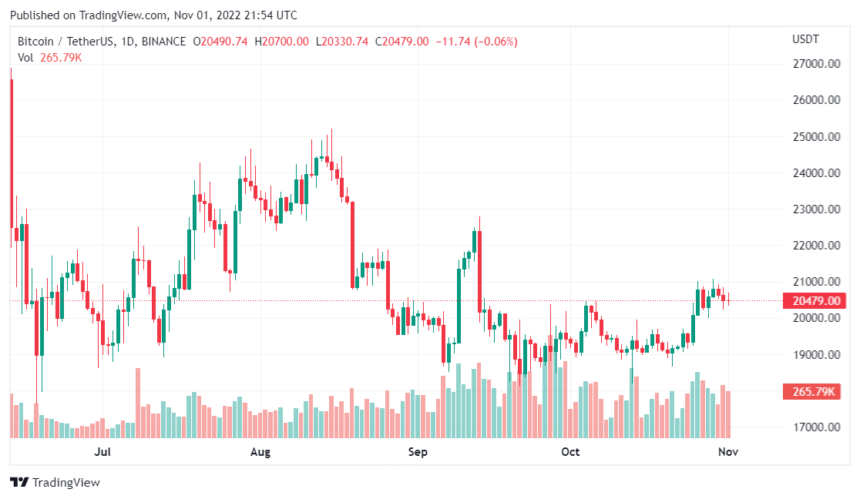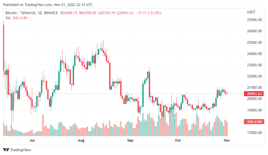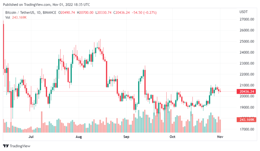 The Bitcoin price is holding on at its current levels with bullish momentum fading on lower timeframes. The crypto market’s recent sideways price actions seem related to the upcoming macroeconomic events and their potential influence across global markets. Related Reading: Bitcoin Mining Giant Argo Blockchain Gets Negative Cash Flows And Stock Price Dips At the time of writing, the Bitcoin price trades at $20,500 with sideways movement in the last 24 hours and a 6% profit over the previous week. Other cryptocurrencies in the top 10 by market capitalization are displaying strength as BTC moves sideways, with Dogecoin (DOGE) leading, followed by Ethereum (ETH) and Solana (SOL). The Bitcoin Price In The Short Term, Risk Of Spike In Volatility The Bitcoin price is under heavy influence from macroeconomic forces. The U.S. Federal Reserve (Fed) is trying to mitigate inflation by tightening its monetary policy, hiking interest rates, and reducing global liquidity. Consequently, Bitcoin and risk-on assets have trended to the downside for 2022. In October, BTC showed a higher correlation with traditional assets due to increased economic uncertainty. Per a recent report by Arcane Research, this status quo is likely to continue. The research firm believes that the Bitcoin price mid-term will still suffer from a high correlation to macroeconomic forces. Fed Chairman Jerome Powell is facing enormous pressure to pivot its monetary policy from internal and external agents in the United States. If Powell gives in, the Bitcoin price will likely benefit and extend its bullish momentum. However, Arcane Research believes it is more probable that Powell stays in its current course, preparing markets for further interest rate hikes. The financial institution and its leadership want to lower inflation in the U.S. dollar regardless of the fallout in global markets. During tomorrow’s Federal Open Market Committee (FOMC) meeting, Powell might offer more clues. The market expects further hikes, but any sign of dovishness could trigger another upside move. Bitcoin Market Susceptible To Squeezes In that sense, Arcane Research records two factors that might contribute to a possible uptrend. The first is high leverage across the crypto market. Short positions continue to pile up as the Bitcoin price trends to the upside. These positions are fuel for BTC if the market takes the long route. In addition, tomorrow’s FOMC meeting will likely trigger volatility which might lead Bitcoin to squeeze out these short positions and reclaim previously lost territory. As Arcane Research noted, volatility during these events is historically high. Related Reading: How MoneyGram Will Let Users Trade Bitcoin And Crypto However, the same is true for the short side of this trade. If the market overreacts to further tightening, expecting the Fed to come out dovish, the cryptocurrency could suffer and revisit the bottom of its range at $18,600. Arcane Research noted: Prepare for shaky markets in early November, as the event calendar is enormously busy in the first half of the month. Tomorrow comes the first.
