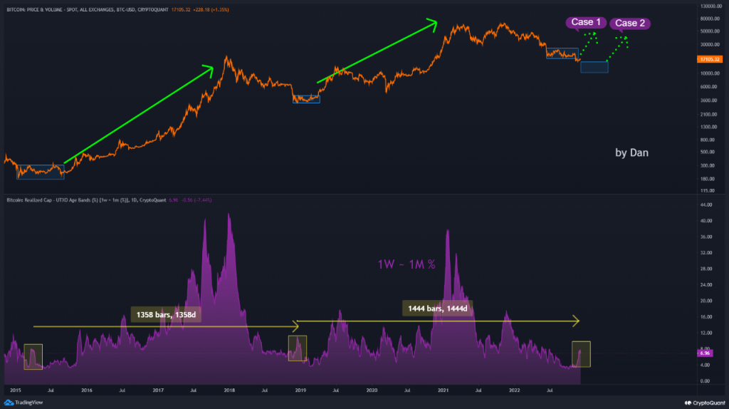 On-chain data shows Bitcoin holders have done some rapid fresh accumulation recently, something that may lead to bottom formation for the cycle. Bitcoin 1w-1m Realized Cap UTXO Age Bands Have Sharply Gone Up As pointed out by an analyst in a CryptoQuant post, the percentage of the BTC realized cap that was last moved between 1 week to 1 month ago has displayed rapid uptrend for the first time in this bear. The “realized cap” is a Bitcoin capitalization model that values each coin in the circulating supply using the price at which it was last moved. The metric then calculates the “true valuation” of BTC by summing up all these values of the individual coins. This is different from the normal market cap, where every coin in circulation has the same one value; the current Bitcoin price. The “realized cap – UTXO age bands” is an indicator that tells us the distribution of the realized cap of each age band in the market. These age bands specify ranges between which UTXOs (or more simply, coins) falling into said age band were last moved. Related Reading: Glassnode: Bitcoin Holders Realized 14x More Losses Than Profits Recently The relevant age band here is the 1w-1m group, which includes all UTXOs that were last moved within 1 week to 1 month ago. Here is a chart that shows how the percentage of the realized cap contributed by this age band has changed over the years: Looks like the value of the metric has sharply gone up in recent weeks | Source: CryptoQuant As you can see in the above graph, the realized cap of the 1w-1m Bitcoin UTXO age band has observed some rapid uptrend recently. The older end of this range, that is, one month ago, is around when the crash due to the FTX collapse took place. Related Reading: Bitcoin Investor Cohorts Now Have Close Cost-Basis, What Does It Say About Market? The indicator’s value rising thus suggests that investors have done some fresh accumulation at the lows following this crash. This is the first time in this Bitcoin bear market that such rapid new accumulation has taken place. From the chart, it’s apparent that such rises have historically coincided with cyclical lows in the price. Another interesting thing to note is that between these spikes in the metric during the previous two cycles, there were 1358 days. The current rise has come 1444 days after the last one, which is a similar length as the gap before. If there really is a pattern here, then the Bitcoin bottom may be very close, if not already in. BTC Price At the time of writing, Bitcoin’s price floats around $16.8k, down 1% in the last week. BTC plunges down | Source: BTCUSD on TradingView Featured image from Kanchanara on Unsplash.com, charts from TradingView.com, CryptoQuant.com