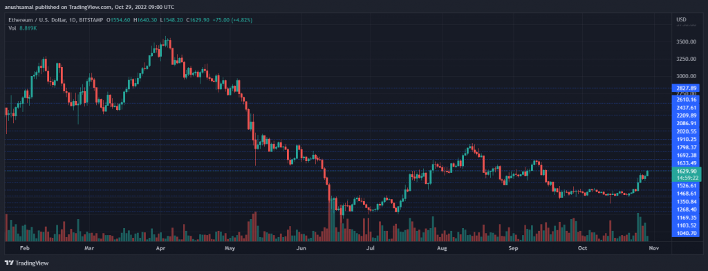 Ethereum price has rallied yet again in the last 24 hours. ETH has demonstrated an 8% jump over the past day. This has made the altcoin break past a few trading levels and now flipped them into support lines. The altcoin was quite bullish at the time of writing. In just one week, the coin gained more than 20%, turning the price action bullish. The technical outlook of Ethereum was also leaned towards the bulls as demand for the altcoin turned heavily positive at the time of writing. As a result, buying strength also turned optimistic at the time of writing. Ethereum can target the $1,700 resistance mark only if the bulls can maintain the price above Ethereum’s immediate resistance mark. If the bulls lose steam, the coin could again start to trade near the $1,500 price zone. The coin could witness a sell-off at the $1,690 resistance mark. If the bulls manage to overturn the $1,690 level, then this could be the start of a broader trend change. Buying strength and wider market strength remain vital for Ethereum. Ethereum Price Analysis: One Day Chart ETH was trading at $1,620 at the time of writing. The coin had struggled to move past the $1,500 price mark over the last few weeks. The recent bullish force has helped Ethereum topple above a number of resistance levels. As Ethereum continues to remain quite favorable, the jump to $1,700 could be possible if the coin breaks past the immediate price ceiling of $1,630. It can experience weighty resistance at the $1,690 level. If the price pushes above that mark, the bulls will stay around for a considerable period of time. A fall from the current price level will bring ETH to $1,520 and then to $1,460, causing ETH to consolidate between those levels. The amount of ETH traded in the last session was positive, indicating a rise in buyers. Technical Analysis The altcoin has accumulated hefty buying strength on its 24-hour chart. The Ethereum price was overvalued due to excessive demand. The Relative Strength Index was above the 80-mark, which is a sign that buyers have heavily outnumbered sellers in the market. Once the asset has visited the overbought zone, the price usually experiences a pull-back. The Ethereum price was above the 20-SMA line, which indicated that demand experienced a steep increase and that buyers were driving the price momentum in the market. Related Reading: Polygon Price Could Aim For These Levels Before The Bulls Wane Off Other technical indicators have also pictured that the bulls were in complete control of the altcoin’s price. The Awesome Oscillator formed green signal bars which were growing in size. These were the buy signals of the coin. AO exhibits the price momentum and the strength of the price direction. The Chaikin Money Flow depicts the capital inflows and outflows at a given time. CMF was above the half-line, which revealed that capital inflows exceeded outflows, painting a positive price action for Ethereum. Related Reading: Avalanche Price Remains Positive But Could Experience Bearish Pull At This Level Featured Image From UnSplash, Charts From TradingView