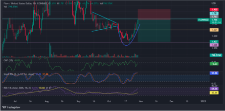 Following a decline from October 10–October 20, FLOW is currently making a comeback. CoinGecko reports that FLOW is performing well across nearly all time frames shown by its platform, and at the time of writing, the coin was trading at $1.76. Along with this rise in price comes an increase in TVL value. DeFiLlama reports that since yesterday, FLOW’s TVL has increased from $3.97 million to $4.168 million, an increase of about 5%. Market slippage was noted earlier, but the market structure produced by FLOW price changes may prevent a recovery. Related Reading: Shiba Inu Facing Tough Hurdles For Weeks – How Could SHIB Overcome These? Going With The Flow The coin has created a bearish descending triangle and cup pattern as of this writing. Due to the coin’s Stoch RSI readings being in the overbought zone, this is the case. After this metric enters the overbought zone, the market immediately begins to realign and correct itself. The current value of Chaikin’s money flow indicator is -0.06, suggesting that selling pressure is prevalent in the market. There has been a slight pick-up in momentum, as shown by the indicator. This rise may be due to the inclusion of the cup’s rebound mechanism. Chart: TradingView Nonetheless, the RSI indicator, which displays a positive divergence at the time of writing, largely disregards these signs. This could be the moment from which the bulls can recover. Currently, FLOW’s uptrend is maintained by the price support level at $1,601, with the current trading range between $1,398 and $1,781. With the price movement being influenced by two bearish patterns. In light of this, we anticipate that the price of FLOW will drop dramatically during the following few days. Downward Current As evidenced by the market, FLOW is on a slippery slope. This notion is bolstered by its technicals, which indicate short- and long-term bearishness. For bulls to survive the forthcoming corrective period, they must defend the $1.398 support level of FLOW’s trading range. However, the bulls might use the existing support at the $1.601 price level to trigger a breakout over the $1.781 resistance range. However, with the Stoch RSI at its highest level, a period of correction is inevitable, hence strengthening the resistance level. At the current market price, investors and traders might initiate a short position in preparation of the forthcoming corrective phase. Related Reading: THETA Shows Renewed Vigor – How Far Can The Coin Push Ahead? FLOW total market cap at $1.89 billion on the weekend chart | Featured image from Freepik, Chart: TradingView.com Disclaimer: The analysis represents the author’s personal views and should not be construed as investment advice.