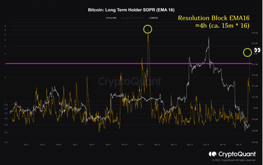 On-chain data shows Bitcoin long-term holders are dumping their coins as BTC plummets below the $17,000 level. Bitcoin Long-Term Holder SOPR Spikes Today As pointed out by an analyst in a CryptoQuant post, some BTC long-term holders seem to have taken profits in the past day. The relevant indicator here is the “Spent Output Profit Ratio,” which tells us whether Bitcoin investors as a whole are selling their coins at a profit or at a loss right now. When this metric has a value greater than 1, it means the average holder has been moving their coins at some profit recently. On the other hand, values below the threshold suggest the overall market has been realizing some loss. Naturally, SOPR exactly equal to 1 implies that the investors are just breaking-even with their selling. Related Reading: Stablecoins Flow Into Spot Exchanges, Fuel For Christmas Bitcoin Rally? The “long-term holder” (LTH) group is a Bitcoin cohort that includes all investors who have been holding onto their coins since at least 155 days ago, without having moved or sold them from a single address. Here is a chart that shows the trend in the Bitcoin SOPR specifically for these LTHs during the last 15 days: Looks like the EMA16 value of the metric has shot up in the last few hours | Source: CryptoQuant As the above graph shows, the Bitcoin LTH SOPR (EMA16) has observed a sharp spike above 1 during the past day. This means that these holders have harvested some profits today. Statistically, LTHs are the investors least likely to sell at any point, so any dumping from them can have noticeable consequences on the BTC market. Related Reading: End Of Litecoin Rally? LTC Plunges 7% In Last 24 Hours From the chart, it’s apparent that when the indicator last saw such a large spike in its value, the price of the crypto had plunged down shortly after. Interestingly, the latest spike has only come after BTC has plunged down under $17k. Usually, such holders sell for profits during rallies, but here the dumping has come after the bullish momentum has already passed over. This could be a sign that with all the FUD going around in the market right now, these supposed diamond hands have also broken down and feel bearish about the prospects of Bitcoin at the moment. Such a trend is likely to be negative for the price, and might take the crypto even further lower. BTC Price The price of the coin seems to have slid down over the last few days | Source: BTCUSD on TradingView At the time of writing, Bitcoin’s price floats around $16.7k, down 2% in the last week. The above chart displays the trend in the value of the crypto over the last five days.