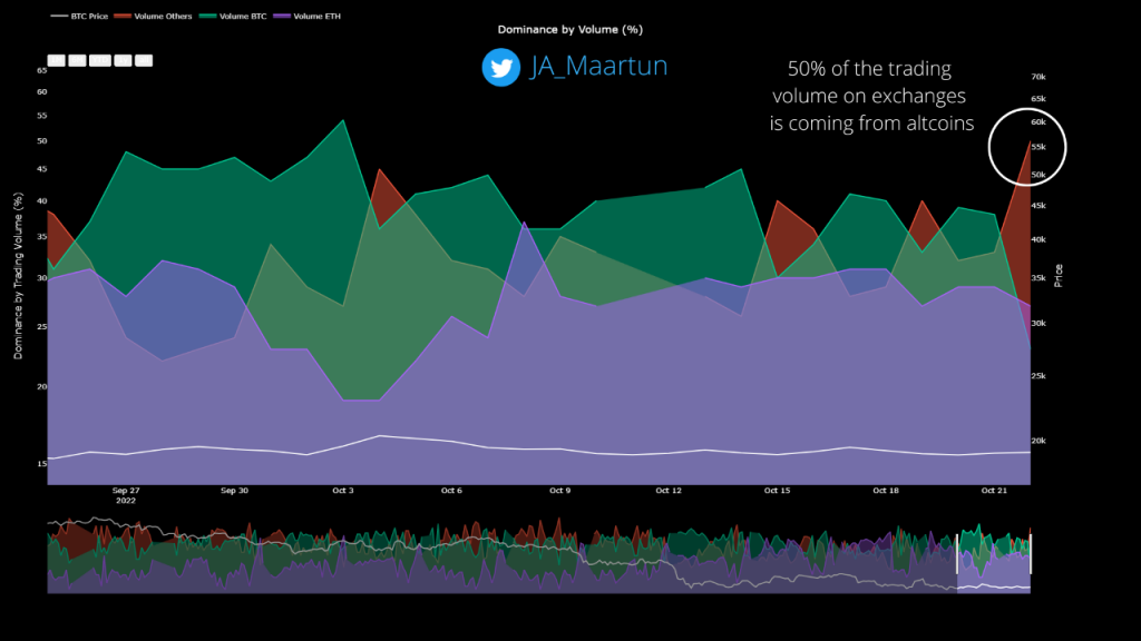 Data shows the altcoin dominance by volume on exchanges has now risen to 50%, here’s what happened to Bitcoin the last two times the crypto market saw such a shift. Altcoins Are Now Contributing To 50% Of The Volumes On Exchanges As pointed out by an analyst in a CryptoQuant post, altcoins have started to dominate after Bitcoin was number one for an entire month. The relevant indicator here is the “trading volume,” which is a measure of the total amount of coins being traded on centralized exchanges. The percentage to this total trading volume being contributed by an individual crypto is called its “dominance by volume.” Here is a chart that shows how the Bitcoin, Ethereum, and altcoin dominances have stacked up against each other during the last month: The value of the metric seems to have declined for BTC in recent days | Source: CryptoQuant As you can see in the above graph, Bitcoin had the largest individual share for much of the past month, but that has changed during the last few days. BTC’s dominance of the trading volume dropping off has given more room to the altcoins, who now contribute to around 50% of the volumes on exchanges. Related Reading: Bitcoin Bearish Signal: Dormant Supply On The Move Again As for Ethereum, the crypto’s volume hasn’t observed any significant shifts recently, with the coin’s dominance moving sideways just below the 30% mark. During the past year, there have been two stretches where altcoins have enjoyed a similar dominance. The below chart shows how the price of Bitcoin behaved while these periods lasted. Looks like the altcoin dominance reached as high as 60% during these stretches | Source: CryptoQuant From the graph, it’s apparent that the first of these altcoin dominated periods occurred back between November 2021 and January 2022. At the start of this timespan, the price of Bitcoin was around $67k, but by the end of it the crypto had declined to just $36k. The second spell of high altcoin volume took place between April and June of this year, and much like the in first stretch, BTC observed a significant drawdown as its price went from $47k all the way down to $20k. Related Reading: TOP 5 Cryptos To Watch This Week – BNB, BTC, ETH, MATIC, APT If the altcoins continue their recent surge in trading dominance on exchanges, and a similar trend as during these previous instances follows now as well, then it may prove to be troubling times for Bitcoin. Bitcoin Price At the time of writing, Bitcoin’s price floats around $19.3k, down 1% in the last week. Over the past month, the crypto has gained 1% in value. BTC continues to be stuck in consolidation | Source: BTCUSD on TradingView Featured image from Traxer on Unsplash.com, charts from TradingView.com, CryptoQuant.com