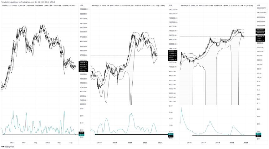 In this episode of NewsBTC’s daily technical analysis videos, we use the Fisher Transform and other tools to see how close Bitcoin is to putting an end to crypto winter. Take a look at the video below: VIDEO: Bitcoin Price (BTCUSD): October 24, 2022 Crypto Winter Bitcoin continues to be boring, but the theme of this video is all about what happens when the notoriously volatile cryptocurrency gets dull. All downside and no rallies makes Bitcoin a dull boy. Related Reading: Bitcoin Dominance To Regain Control Over Crypto? | BTC.D Analysis October 20, 2022 “Here’s Johnny:” What Happens When Bitcoin Becomes A Dull Boy The Bollinger Bands are getting even tighter, showing that explosiveness is coming soon enough and this ongoing lull is just the calm before the storm. Daily Bollinger Band Width is now at the lowest point since October 2020 right before the bull breakout in 2020. Prior to that, the bands got that tight just ahead of the collapse to the bear market bottom in 2018. On weekly timeframes, Bollinger Band Width is the tightest since the November 2018 breakdown, where Bitcoin dropped another 50% to its eventual bottom. All instances before that when the bands got this tight led to an enormous rally. The monthly timeframe shows a very unusual phenomenon. The Bollinger Bands are actually now expanding after being some of their tightest ever. Rising after such a lull in volatility has in the past always triggered a trendmous bull run. Is the third time the charm? The Bollinger Bands are some of the tightest ever | Source: BTCUSD on TradingView.com Related Reading: Is The Final Wave In Ethereum Up Next? | ETHUSD Analysis October 19, 2022 Why We Could Have Several More Weeks Of Crypto Winter After this weekend’s weekly close, Bitcoin bulls have now closed three full weeks with a confirmed bullish crossover on the LMACD. Compared to the 2018 bear market bottom, we would only be a week or so away from making a larger move upward. However, a comparison with the 2015 bear market bottom shows that although new lows might not arrive, there could be twice as long to wait before the bottom is confirmed as in and the range is left behind. Other possible signals on weekly timeframes that could suggest we’ve seen the bottom already, is that Heiken Ashi candles are starting to turn green. How much longer will crypto winter last? | Source: BTCUSD on TradingView.com Related Reading: Bitcoin Price Action Falls Flat | BTCUSD Analysis October 18, 2022 Cyclical Timing Tools Suggest Spring Is Almost Here The two-week Fisher Transform has also started to flip bullish (pictured right). But it will take another 14 days to confirm the signal. The Fisher Transform is used to find major turning points in markets, but works best on the highest timeframes. Moving to the monthly timeframe (pictured left), we can see that even here the Fisher has very little room left and if Bitcoin hands around here for another week or so, the monthly should begin to flatten, signaling a possible turnaround in price action. The Fisher Transform is based on a standard deviation formula, and with Bitcoin monthly at a -3.0 standard deviation, there is only a limited 0.1% chance the bear market will continue. Will the Fisher flip and confirm the bottom? | Source: BTCUSD on TradingView.com Learn crypto technical analysis yourself with the NewsBTC Trading Course. Click here to access the free educational program. Follow @TonySpilotroBTC on Twitter or join the TonyTradesBTC Telegram for exclusive daily market insights and technical analysis education. Please note: Content is educational and should not be considered investment advice. Featured image from iStockPhoto, Charts from TradingView.com