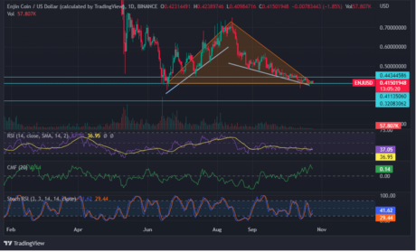 Cryptocurrency whales are now investing heavily on Enjin Coin. Cryptocurrency whale tracker WhaleStats reports a total of 28,551,132 ENJ coins are in the whales’ possession. Given that one token is now trading at a market price of $0.4141, this amounts to $11.8 million. In tandem with the whale frenzy on ENJ coin, the Enjin development team has also launched a beta version of their native wallet. More investors will get behind the idea and the coin if these trends continue. JUST IN: $ENJ @enjin now on top 10 by trading volume among 500 biggest #ETH whales in the last 24hrs 🐳 Peep the top 100 whales here: https://t.co/tgYTpOmDm0 (and hodl $BBW to see data for the top 500!)#ENJ #whalestats #babywhale #BBW pic.twitter.com/CKt2sXrUUf — WhaleStats (tracking crypto whales) (@WhaleStats) October 22, 2022 Consequently, this is good news for the ENJ coin’s market price. Despite this, the coin has an extremely negative market mood. Related Reading: Dogechain (DC) Notches 200% Hike In Trading Value In The Past Week Enjin Needs A Shot In The Arm As of this writing, token metrics are not encouraging. Coingecko reports that, over the past 24 hours, the coin has gained 0.7%, which is not nearly enough to make up for the losses incurred over the preceding seven days. Each of the weekly, biweekly, and monthly averages is in the red. Meanwhile, a Twitter user by the name of CryptoDoc said that ENJ coin would never again be worth what it is now. This could serve as a synopsis of the data presented in the graphics. Chart: TradingView Currently, the cryptocurrency is trading at levels not seen since February last year. The currency reached this level during the June fall and returned to the $0.75 price range in August. Nonetheless, larger market pressures drove the price to a low in June. This is an important juncture for the coin. Anything below this threshold will render ENJ useless in the Enjin ecosystem. What Lies Ahead For ENJ The most probable future for ENJ is a bearish one, some analysts say. As of this writing, the momentum indicator suggests a continuation of the downturn to the trough in January 2021. Current RSI values support this notion. However, according to Chaikin’s money flow indicator, bulls currently control the market. This may have been caused by the whale buying binge. The Stoch RSI values support a possible bullish activity in the near future. The triangle pattern that has formed as a result of the coin’s past price movements will pose a significant barrier to any potential rebound. For a price recovery to occur, today’s candle must close green, which is a bullish indicator for investors and traders. A green ending price today could provide ENJ with the impetus required to test the $0.443 barrier level. Related Reading: Cosmos In A Downtrend Since Last 2 Months – Investors Shying Away From ATOM? Crypto total market cap at $890 billion on the daily chart | Featured image from The VR Soldier, Chart: TradingView.com Disclaimer: The analysis represents the author’s personal views and should not be construed as investment advice.