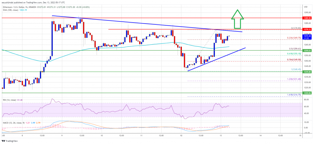 Ethereum remained supported above the $1,240 level against the US Dollar. ETH is rising and might soon attempt an upside break above the $1,300 barrier. Ethereum remained well bid above the $1,240 and $1,220 levels. The price is now trading above $1,260 and the 100 hourly simple moving average. There is a major contracting triangle forming with resistance near $1,280 on the hourly chart of ETH/USD (data feed via Kraken). The pair could start a strong increase if there is a clear move above the $1,300 barrier. Ethereum Price Eyes Upside Break Ethereum price started a downside correction from the $1,285 resistance. ETH declined below the $1,260 level and the 100 hourly simple moving average. However, the bulls were again active near the $1,240 support zone. A low was formed near $1,240 and ether price started a fresh increase, similar to bitcoin. The price climbed above the $1,260 level and the 100 hourly simple moving average. It is now consolidating near the $1,275 level. There was a test of the 23.6% Fib retracement level of the recent increase from the $1,240 swing low to $1,278 high. An immediate resistance on the upside is near the $1,280 level. There is also a major contracting triangle forming with resistance near $1,280 on the hourly chart of ETH/USD. The first major resistance is near the $1,290 and $1,300 levels. Source: ETHUSD on TradingView.com A close above the $1,300 resistance might start a strong increase. The next major resistance could be $1,340. Any more gains might send the price towards the $1,400 resistance zone. Fresh Decline in ETH? If ethereum fails to climb above the $1,280 resistance, it could start another downside correction. An initial support on the downside is near the $1,260 level and the 100 hourly simple moving average. The 50% Fib retracement level of the recent increase from the $1,240 swing low to $1,278 high is also near $1,260. The next major support is near the $1,240 level, below which the price could even retest the $1,200 support. Any more losses could lead the price towards the $1,165 support in the coming days. Technical Indicators Hourly MACD – The MACD for ETH/USD is now gaining momentum in the bullish zone. Hourly RSI – The RSI for ETH/USD is now well above the 50 level. Major Support Level – $1,240 Major Resistance Level – $1,300