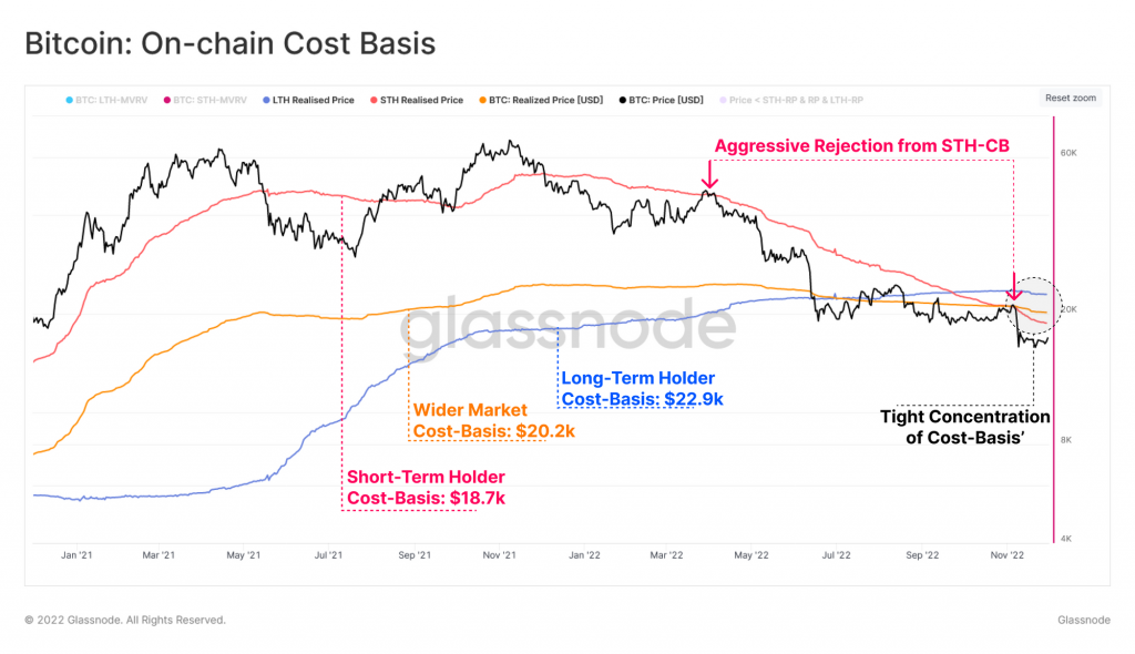 Data shows the different Bitcoin investor cohorts now have their cost-basis packed together in a tight range. Here’s what this may tell us about the current market. All Bitcoin Investor Groups Have Cost-Basis Between $18.7k And $22.9k According to the latest weekly report from Glassnode, the cost-basis of the wider BTC market is currently around $20.2k. Here, the “cost-basis” refers to the price at which the average investor in the Bitcoin market acquired their coins. The entire market can be split into two main investor cohorts, the “short-term holders” (STHs) and the “long-term holders” (LTHs). The STH group includes all investors that acquired their coins within the last 155 days. The LTHs, on the other hand, are made up by holders that have been holding their coins since more than 155 days ago. Statistically, the LTH group is the cohort that’s least likely to sell their coins at any point, since the longer investors keep their coins the less probable they become to break their dormancy. Related Reading: Bitcoin Now Undervalued For 170 Days, How Does This Compare With Previous Bears? The cost-basis of either of these two groups is the price at which the average investor belonging to said cohort bought their coins. Now, here is a chart that shows the trend in the cost-basis of both LTHs and STHs, as well as that of the wider Bitcoin market: Looks like the price was rejected by the STH cost-basis not too long ago | Source: Glassnode’s The Week Onchain – Week 49, 2022 As you can see in the above graph, the cost-basis of the Bitcoin STHs has declined as the bear market has gone on, something that makes sense as this cohort only includes investors who bought recently. Naturally, the “recent” prices during the bear have been lower and lower. The LTH cost-basis has slightly trended up as investors who bought during the higher prices are now a part of this group. Currently, this metric has a value of $22.9k. Related Reading: For First Time Ever, Bitcoin Hash Ribbon Golden Cross Has Failed This isn’t too far from the $18.7k cost-basis of the STHs and the $20.2k cost-basis of the wider market. This means that the different investor groups in the current market have acquired their coins at similar prices. The implication of this is that the perceived risk and opportunity among all the holders, whether short-term or long-term, is the same. “As such, it is more likely that the aggregate market will start to behave in a more cohesive manner in response to volatility,” notes the report. BTC Price At the time of writing, Bitcoin’s price floats around $17k, up 3% in the last week. BTC continues to hold still around the $17k mark | Source: BTCUSD on TradingView Featured image from iStock.com, charts from TradingView.com, Glassnode.com