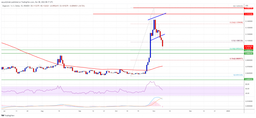 Dogecoin declined below the $0.14 support against the US Dollar. DOGE tested the $0.070 support and now aims a fresh move above the $0.10 resistance. DOGE started a fresh decline below the $0.14 and $0.12 levels against the US dollar. The price is trading well below the $0.110 zone and the 100 simple moving average (4-hours). There was a break above a key bearish trend line with resistance near $0.088 on the 4-hours chart of the DOGE/USD pair (data source from Kraken). The pair must stay above the $0.070 support zone to avoid more losses. Dogecoin Price Aims Fresh Increase In the past few days, dogecoin saw a major decline from well above the $0.14 level. DOGE declined below the $0.12 and $0.10 support levels, similar bitcoin and ethereum. The price even broke the $0.085 support and tested the $0.07 support zone. A low was formed near $0.0699 before the bulls took a stand. The price formed a base above the $0.07 level and recently started a recovery wave. There was a move above the $0.075 and $0.080 levels. Besides, there was a break above a key bearish trend line with resistance near $0.088 on the 4-hours chart of the DOGE/USD pair. The price is now trading well below the $0.110 zone and the 100 simple moving average (4-hours). On the upside, the price is facing resistance near the $0.0915 level. It is near the 23.6% Fib retracement level of the downward move from the $0.1609 swing high to $0.0699 low. Source: DOGEUSD on TradingView.com The first major resistance is near the $0.1100 level and the 100 simple moving average (4-hours). Any more gains above the $0.1100 zone could encourage the bulls to aim a test the 50% Fib retracement level of the downward move from the $0.1609 swing high to $0.0699 low at $0.115. Fresh Decline in DOGE? If DOGE price fails to gain pace above the $0.10 level, it could start another decline. An initial support on the downside is near the $0.0820 level. The next major support is near the $0.070 level. If there is a downside break below the $0.070 support, the price could decline further. The main support is near the $0.0500 level. Any more losses could open the doors for a move towards the $0.0450 level. Technical Indicators 4-Hours MACD – The MACD for DOGE/USD is now gaining momentum in the bullish zone. 4-Hours RSI (Relative Strength Index) – The RSI for DOGE/USD is now above the 50 level. Major Support Levels – $0.0850, $0.0800 and $0.0700. Major Resistance Levels – $0.0915, $0.1000 and $0.1100.