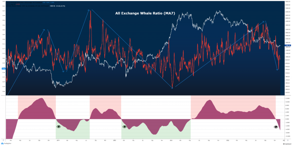 On-chain data shows the Bitcoin exchange whale ratio has sharply declined recently, a sign that may prove to be bullish for the price of the crypto. Bitcoin 7-Day MA Exchange Whale Ratio Has Rapidly Gone Down Recently As pointed out by an analyst in a CryptoQuant post, the metric also saw a similar decline during the end of 2018. The “exchange whale ratio” is an indicator that measures the ratio between the sum of the top ten transactions going to exchanges, and the total exchange inflows. The ten largest transfers to exchanges are assumed to be coming from the whales. So, this ratio tells us what part of the total exchange inflows is being contributed by these humongous holders right now. When the value of this metric is high, it means the majority of the inflows are made up by whales currently. Since one of the main reasons investors deposit to exchanges is for selling purposes, such values could be a sign that whales are dumping large amounts, and might hence be bearish for the price of the crypto. Related Reading: Glassnode: Bitcoin Holders Realized 14x More Losses Than Profits Recently On the other hand, the indicator having low values suggests whales are making a healthier contribution to the inflows, and could thus be either neutral or bullish for the value of BTC. Now, here is a chart that shows the trend in the 7-day moving average Bitcoin exchange whale ratio over the last few years: Looks like the 70-day MA value of the metric has been sharply falling off in recent weeks | Source: CryptoQuant As you can see in the above graph, the Bitcoin exchange whale ratio had a pretty high value just a few months back. However, since then, the indicator has been observing some rapid downtrend, and the ratio has now attained quite tame values. Related Reading: Bitcoin Investor Cohorts Now Have Close Cost-Basis, What Does It Say About Market? This means that whales have been reducing their inflow volumes recently, suggesting that selling pressure from them may be getting exhausted. The quant has also highlighted the trend in the exchange whale ratio during the previous Bitcoin cycle in the chart. It seems like a similar downtrend as now was also seen back in late 2018, when the bottom of that bear market formed. The analyst notes that while it’s impossible to say if the current sharp decline in the whale ratio means the bottom is in for this cycle as well, it’s likely that at least the volatility will now begin to cool down. BTC Price At the time of writing, Bitcoin’s price floats around $16.8k, down 1% in the last week. BTC has declined during the past day | Source: BTCUSD on TradingView Featured image from Thomas Lipke on Unsplash.com, charts from TradingView.com, CryptoQuant.com