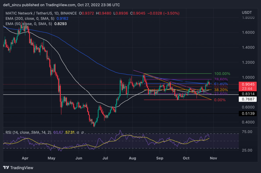 MATIC’s price shows strength as it bounces from a downtrend range price rallied to a high of $0.95 with eyes set on $1. MATIC faces a major issue break and holds above 61.8% Fibonacci value and trends higher to a region of $1. MATIC’s price remains strong on the daily timeframe above the 50 Exponential Moving Average (EMA) as the price aims for more rallies. The price of Polygon (MATIC) has been one of the standout performers during the past few weeks that saw the price of Bitcoin (BTC), Ethereum (ETH), and other altcoins struggle to hold their key Support, the price of Polygon (MATIC) showed strength holding above and bouncing off that region of $0.77 away from this support area. The past few days have seen the crypto market has looked more decent, with the likes of Bitcoin (BTC) and Ethereum (ETH) showing some great price movement in recent times. MATIC’s price is rallying from $0.83 to a region of $0.95 as the price aims to take the market by its horn. (Data from Binance) Related Reading: The Inverted Bitcoin Chart Bears Don’t Wanna See | BTCUSD Analysis October 27, 2022 Polygon (MATIC) Price Analysis On The Weekly Chart In recent times, Polygon has struggled to regain its bullish momentum; despite the uncertainty that has befallen the crypto space, the price of MATIC held its ground as price defended its key support area of $0.77. MATIC’s price had struggled to replicate its rally that took the price of MATIC to an all-time high of $3 before it faced rejection to trend higher. After trading in a range for weeks as the price continued to look difficult to trade due to little to no volume to push the price higher as the price continued to look stagnated, MATIC finally showed some movement, rallying from its weekly low of $0.75 to $0.85 and closing higher after several weeks. Weekly resistance for the price of MATIC – $1. Weekly Support for the price of MATIC – $0.77. Price Analysis Of MATIC On The Daily (1D) Chart In the daily timeframe, the price of MATIC continues to show a more bullish scenario as the price rallied to a high of $0.95 before facing resistance to the trend to a region of $1. The price of MATIC needs to break and hold above $0.97 for the price to trend higher to a region of $1, which is a key supply zone for most traders. The Fibonacci retracement (Fib) value of 61.8% indicates MATIC’s price faced a rejection to trend higher as the price tried to break above this key value. The price of $0.97 corresponds to the Fib value of 61.8%. If the price of MATIC closes above this level, we could see a rally to $1-$1.2. Daily resistance for the MATIC price – $1. Daily Support for the MATIC price – $0.85. Related Reading: Can Elon Musk Influence The Next US Election? Featured Image From zipmex, Charts From Tradingview