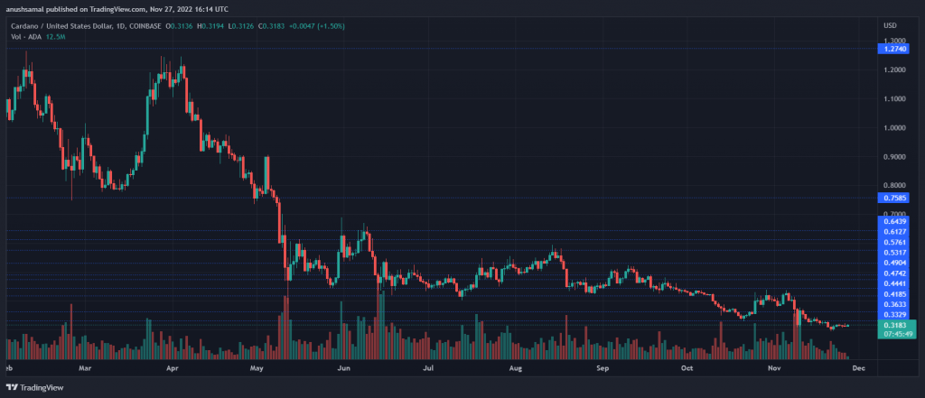 The Cardano price continues to suffer a downtrend throughout the month of November. Over the last 24 hours, ADA registered a 0.6% depreciation. ADA’s next upcoming trading sessions remain crucial as the market is expected to move out of lateral trading. Depending on how quickly it breaks through its current resistance. The bears continue to pull down the price level. Bears will continue to succeed if ADA doesn’t claim the $0.36 price. A buying resurgence could help ADA move upwards, marking the start of bullish price action. Continued demand for the coin can also potentially form a rally. The overhead hurdle of $0.32 remains crucial for the altcoin. Today’s global cryptocurrency market cap is $879 billion, with a 0.0% change in the last 24 hours. Related Reading: Uniswap Price Struggles At $5.49, Will There Be A Run Up To $6? Cardano Price Analysis: One-Day Chart ADA was exchanging hands at $0.31 at press time. Over the last 24 hours, Cardano’s price witnessed an increase in buying pressure. Immediate resistance for ADA is awaited at $0.32. After overtaking the aforementioned price mark and flipping it into a support floor, there are chances of ADA appreciating by 18%. Moving above the $0.32 price mark will propel the asset price to $0.36 first and then to $0.38. On the flip side, if ADA cannot break past the $0.31 level, it will cause the coin to fall to $0.29. The amount of Cardano exchanged in the past session was in green, indicating that demand grew for the altcoin. Technical Analysis Since November 26, the coin has registered a slight growth in buyers. The Relative Strength Index shot slightly past the 40-mark, noting a slight increase in demand. The buying strength, however, continues to be neutral. The price of the altcoin was below the 20-Simple Moving Average. This reading indicated that the selling pressure continues to dominate as sellers drive the market’s price momentum. ADA has also witnessed mixed signals on the one-day chart. Per the buying strength, the Awesome Oscillator also started to depict positive price action. The green signal bars on AO were the buy signal for the coin. On the other hand, the Parabolic SAR signaled that downward price movement. The dotted lines were above the price candlestick, indicating that the bears continue to drive the price action in the market. ADA must cross the $0.32 threshold for bullish forces to take over. Related Reading: Bitcoin Price Recovery; Vital Levels To Keep An Eye On Featured Image From UnSplash, Charts From TradingView