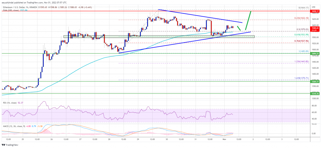 Ethereum remained well bid above the $1,550 zone against the US Dollar. ETH could start a fresh increase if it clears the $1,625 resistance zone. Ethereum is stable and is showing positive signs above the $1,550 support zone. The price is now trading above $1,560 and the 100 hourly simple moving average. There is a major contracting triangle forming with resistance near $1,620 on the hourly chart of ETH/USD (data feed via Kraken). The pair could start a fresh increase if it clears the $1,620 and $1,625 levels. Ethereum Price Eyes Fresh Increase Ethereum started a downside correction after it formed a short-term top near the $1,665 level. ETH declined below the $1,620 and $1,600 levels. There was a move below the 50% Fib retracement level of the key wave from the $1,485 swing low to $1,665 high. Ether price even spiked below the $1,580 level and the 100 hourly simple moving average. However, the bulls were active near the $1,550 support zone. It found bids near the 61.8% Fib retracement level of the key wave from the $1,485 swing low to $1,665 high. The price is now trading above $1,560 and the 100 hourly simple moving average. There is also a major contracting triangle forming with resistance near $1,620 on the hourly chart of ETH/USD. An immediate resistance on the upside is near the $1,620 level and the triangle trend line zone. The first major resistance is near the $1,640 and $1,650 levels, above which the price could gain bullish momentum. Source: ETHUSD on TradingView.com In the stated case, the price could even test the $1,700 level. Any more gains might send the price toward the $1,800 resistance zone. Dips Limited in ETH? If ethereum fails to climb above the $1,625 resistance, it could continue to move down. An initial support on the downside is near the $1,575 level and the 100 hourly simple moving average. The first major support is near the $1,550 level and the triangle lower trend line. A downside break below the $1,550 zone might increase selling pressure. In the stated case, ether price may perhaps decline towards the $1,500 support zone in the near term. Technical Indicators Hourly MACD – The MACD for ETH/USD is now losing momentum in the bearish zone. Hourly RSI – The RSI for ETH/USD is now above the 50 level. Major Support Level – $1,550 Major Resistance Level – $1,625