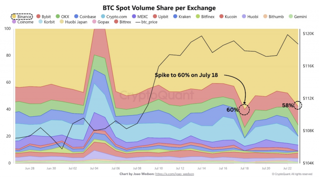 Bitcoin (BTC) may be on the cusp of another rally, as leading cryptocurrency exchange Binance saw its spot volume rise from around 40% on July 15 to as high as 60% on July 18. Historical data suggests that surges in Binance’s spot market share have frequently preceded upward movements in BTC’s price. Bitcoin Rally Imminent? Binance Data Suggests So According to a CryptoQuant Quicktake post by contributor Amr Taha, Binance’s spot volume market share surging to 58% on July 23, has further strengthened the premier cryptocurrency’s $117,000 support. Related Reading: Bitcoin Sees Long-Term Holders Sell As Short-Term Buyers Step In – Sign Of Rally Exhaustion? This marks the second notable spike in Binance’s spot market dominance this month. On July 18, Binance’s share surged to 60%, coinciding with Bitcoin holding above the critical $117,000 mark on the daily chart. Since then, the $117,000 level has served as a reliable support zone, likely buoyed by Binance’s deep liquidity and high execution reliability. Price stability at this level has been observed multiple times since the initial breakout. In addition to this, Bitcoin’s price has shown strong resilience around the Realized Price of the 1-day to 1-week Unspent Transaction Output (UTXO) Age Band, which is currently near $118,300. For context, UTXO age bands classify Bitcoin held in wallets based on how long it has remained unspent, offering insight into investor behavior. Shorter bands – 1 day to 1 week – typically reflect activity by newer or speculative holders, while longer bands – 6 months to 5 years – are associated with long-term holders with stronger conviction. Taha explained: Historically, this metric acts as a dynamic support level, indicating that newer holders are not capitulating and that the average on-chain cost basis of recent buyers is being respected by the market. Meanwhile, fellow crypto analyst Titan of Crypto took to X to highlight BTC following the bullish inverse head and shoulders pattern. In an X post, the analyst shared the following weekly chart, adding that BTC is on track to hit a target of $144,000. Will BTC Hit $180,000 By Year End? Bitcoin’s recent all-time high (ATH) of $123,218 has reignited speculation around even higher price targets before year’s end. According to CryptoQuant analyst Chairman Lee, BTC remains on track to reach $180,000 by the end of 2025. Related Reading: Bitcoin Rally Not Over Yet? Short-Term Holder MVRV Suggests Further Upside Recent on-chain metrics support this bullish outlook. Notably, the Bitcoin IFP indicator suggests that major holders continue to hold BTC despite its proximity to record highs – unlike in previous cycles, where exchange inflows typically preceded significant corrections. However, not all indicators point upward. Exchange reserves recently reached their highest levels since June 25, raising concerns about potential sell pressure. At press time, BTC is trading at $119,097, up 0.6% in the past 24 hours. Featured image from Unsplash, charts from CryptoQuant, X, and TradingView.com