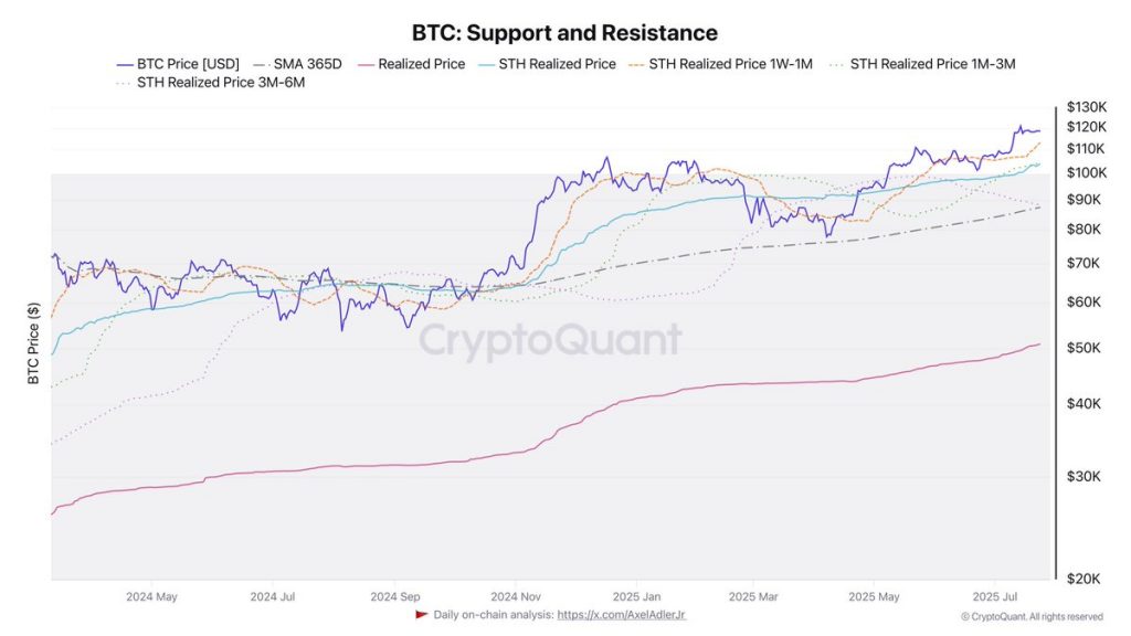 Bitcoin saw a modest retracement yesterday, dipping slightly but continuing to trade within a tight range between key support and resistance levels. While the broader altcoin market faces heightened volatility and notable losses, BTC remains relatively resilient, yet momentum appears uncertain. Analysts warn that if sentiment weakens, a broader correction could unfold. Related Reading: Ethereum Adoption Accelerates As Daily Transactions Set 2025 Record Top analyst Darkfost highlighted a critical dynamic now unfolding: the vulnerability of Short-Term Holders (STH). These investors, who entered the market during recent price surges, hold Bitcoin at significantly higher cost bases. As price action stalls or retraces, they’re typically the first to capitulate, creating increased selling pressure. With altcoins already under stress, all eyes remain on whether Bitcoin can hold above current support levels or if it, too, will start to crack under short-term selloffs. This phase could act as a stress test for recent buyers, while long-term holders and institutional participants continue to monitor key price zones. Key Realized Price Levels Suggest Bitcoin Structure Remains Bullish Darkfost has shared a chart offering a deep dive into Bitcoin’s realized prices across various holding cohorts, particularly focusing on Short-Term Holders (STHs). These metrics are proving crucial in identifying support zones that could be defended if the price continues to correct in the short term. The broader realized price for Bitcoin currently stands at $50.8K, while the annual average is significantly higher at $87.5K. More critically, the realized price for STHs—those who purchased coins recently—is positioned at $103.9K. Breaking this down further, we see realized prices by time held: STH 3m–6m: $88.2K STH 1m–3m: $104.1K STH 1w–1m: $113K These figures represent the average price at which different groups of recent investors acquired their coins. As such, they serve as psychological and technical support levels during corrections. With Bitcoin currently consolidating after a small retracement, bulls are eyeing these realized price zones to gauge whether the structure remains bullish. The $104K level, in particular, is essential—it aligns closely with the 1m–3m STH realized price and could serve as a decisive line for sentiment and price defense. If buyers can hold BTC above this level, the market’s bullish structure will likely remain intact, suggesting healthy consolidation rather than trend reversal. Conversely, losing it could trigger short-term panic selling among recent entrants. Related Reading: Bitcoin Holders Still Reluctant To Sell – Supply Active Data Shows Room For Upside Bitcoin Price Analysis: Key Levels Hold After New Highs Bitcoin continues to consolidate in a tight range after setting fresh all-time highs earlier this month. As seen in the 3-day chart, BTC is holding above $115,724—a key horizontal support—and below immediate resistance near $122,077. This consolidation range has remained intact for over a week, reflecting both strong demand and hesitation near psychological resistance. Despite the recent small pullback, the overall market structure remains bullish. Price is trading well above the 50-day ($98,536), 100-day ($93,833), and 200-day ($76,201) simple moving averages, which continue to slope upward. This confirms strong medium- and long-term momentum. Related Reading: Tron Outpaces Ethereum In Fee Revenue – TRX Burn Accelerates Volume has declined slightly during the current range-bound movement, indicating a pause after the aggressive rally from below $100,000. However, bulls are clearly defending the $115,000–$116,000 region, a zone that coincides with the top of the previous breakout. Featured image from Dall-E, chart from TradingView