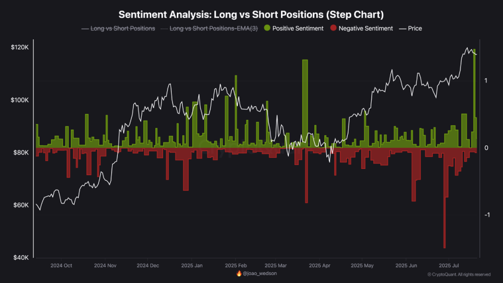 Bitcoin’s recent price action reflects a consolidation phase rather than a decisive move in either direction. After briefly touching an all-time high of over $123,000 earlier this month, BTC has seen a gradual pullback, currently trading around $118,000 at the time of writing. This represents a 1.1% drop in the last 24 hours and a 3.9% decline from its peak, as traders evaluate whether the current market structure suggests a continuation or a correction. According to new insights from CryptoQuant contributors, indicators present a split narrative. Some metrics suggest rising optimism among traders, while others indicate a more cautious and holding-focused environment. Related Reading: Trump Shares Viral Bitcoin Breakdown — Here’s What He Posted Surge in Long Positions Raises Contrarian Concerns CryptoQuant contributor BorisVest highlighted a notable spike in the long/short sentiment ratio on Binance, showing a growing preference among traders for long positions. This metric, which tracks the volume of long versus short positions on the exchange, has tilted significantly bullish within the $116,000–$120,000 price range. He noted that during Bitcoin’s previous consolidation between $100,000 and $110,000, sentiment leaned toward short positions, a setup that preceded a breakout to the upside and a wave of short liquidations. This time, however, the environment has flipped. BorisVest explained: Now that sentiment is skewed heavily toward longs, the same principle could apply in reverse. When the majority positions in one direction, it often creates a setup for the opposite move. The current range is acting as a trap zone, where traders’ expectations are repeatedly tested. The historical tendency for sentiment extremes to precede contrary price action has prompted some analysts to advise caution, suggesting that growing bullish bias could lead to a temporary reversal if met with enough liquidity pressure. Bitcoin Exchange Flow Patterns Reflect Investor Patience While Binance sentiment data leans bullish, another key on-chain indicator paints a different picture. CryptoQuant analyst Arab Chain examined the Bitcoin Flow Pulse (IFP) indicator, which tracks BTC movements to centralized exchanges. Related Reading: Bitcoin Must Defend This Key Support For $180,000 Year-End Target, Analyst Says According to the data, despite Bitcoin’s recent high above $120,000, there has not been a corresponding spike in exchange inflows, suggesting that investors are not rushing to take profits or exit the market. This behavior contrasts with historical cycles in 2017 and 2021, where price peaks were accompanied by large exchange inflows and followed by corrections. Arab Chain wrote: The market now shows a consolidating trend, with reduced selling pressure. The low flow to exchanges indicates confidence among holders and suggests that many participants are expecting the uptrend to continue. Still, he cautioned that a shift in the IFP indicator, such as a sudden rise in exchange flows, could act as an early warning for increased supply pressure. Featured image created with DALL-E, Chart from TradingView