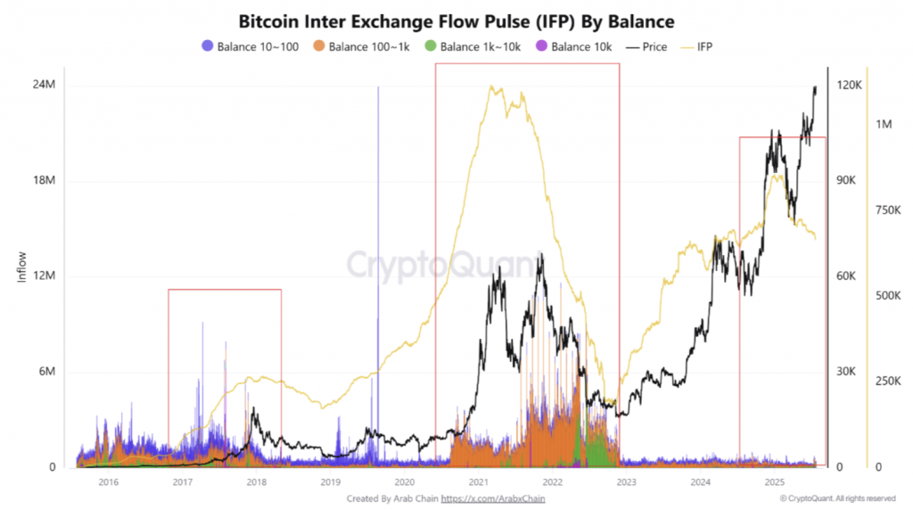 As Bitcoin (BTC) continues to trade near its all-time high (ATH) of $123,218, concerns over rising exchange deposits are mounting. However, fresh on-chain data reveals a significant contrast between the current rally and previous ones – most notably, a decline in BTC deposits to exchanges. Bitcoin Flow Pulse Shows Low Exchange Activity According to a CryptoQuant Quicktake post by contributor Arab Chain, the Bitcoin Inter-Exchange Flow Pulse (IFP) indicator is exhibiting “interesting behavior” in mid-2025. Notably, large investors do not appear to be selling their holdings, despite BTC trading at record highs. Related Reading: Bitcoin Reserves On Exchanges Hit Highest Level Since June 25 – Is BTC In Danger? Typically, sophisticated investors begin profit-taking as an asset approaches ATH territory. However, that behavior appears to be largely absent this time. The lack of selling activity stands in contrast to the market peaks of 2017 and 2021. During both these instances, there were large BTC inflows to exchanges, which were closely followed by significant price corrections. Arab Chain shared the following chart highlighting the relationship between a rising IFP and Bitcoin’s price trajectory. The chart illustrates how price corrections followed rising IFP levels at the end of 2017 and again in 2021. In 2025, despite an IFP surge earlier in the year, the BTC market has since consolidated rather than corrected. For context, the IFP indicator tracks the volume of Bitcoin transferred between centralized exchanges, providing insights into investor sentiment and market conditions. A rising IFP typically suggests growing intent to sell or arbitrage, while a declining IFP indicates reduced exchange activity and stronger holder conviction. This year’s dynamic between IFP and BTC price suggests investors are choosing to hold Bitcoin, even as prices hover near record highs. Arab Chain noted that such behavior reinforces the bullish case. They said: This behavior indicates high confidence in the uptrend so far and partly explains why the price has continued to rise without any clear selling pressure. On the other hand, if the Bitcoin IFP indicator begins to rise, it indicates an intention to sell and an anticipated significant supply pressure. Therefore, a sudden rise in the indicator is a strong warning sign for speculators. BTC Miners Engaging In Profit-Taking While large investors remain largely inactive on the selling front, Bitcoin miners appear to be cashing in on the current rally. Miner outflows surged to 16,000 BTC on July 15 – the highest single-day level since April 7. Related Reading: No Mania Yet: Bitcoin ATH Lacks Hype, Suggesting Further Upside Potential As selling pressure builds, recent analysis by CryptoQuant contributor Chairman Lee highlights a key support level that BTC must defend to remain on track for the $180,000 year-end target. At press time, BTC trades at $117,529, down 1.4% in the past 24 hours. Featured image from Unsplash, charts from CryptoQuant and TradingView.com