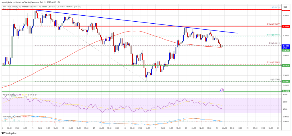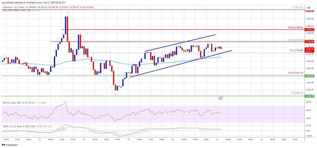 Ethereum price is showing positive signs above the $2,680 zone. ETH is gaining pace and an upside break above $2,755 could trigger bullish moves. Ethereum is still showing positive signs above the $2,650 zone. The price is trading above $2,720 and the 100-hourly Simple Moving Average. There is following a key rising channel with support at $2,725 on the hourly chart of ETH/USD (data feed via Kraken). The pair could start a decent upward move if it settles above $2,755 and $2,800. Ethereum Price Eyes Upside Break Ethereum price remained supported above the $2,550 level and recently started a decent upward move, but it underperformed Bitcoin. ETH gained pace above the $2,650 and $2,660 resistance levels. The price even cleared the 50% Fib retracement level of the downward wave from the $2,845 swing high to the $2,604 low. There was also a move above the $2,720 resistance level. Besides, the price is following a key rising channel with support at $2,725 on the hourly chart of ETH/USD. Ethereum price is now trading above $2,720 and the 100-hourly Simple Moving Average. On the upside, the price seems to be facing hurdles near the $2,755 level. It is close to the 61.8% Fib retracement level of the downward wave from the $2,845 swing high to the $2,604 low. The first major resistance is near the $2,790 level. The main resistance is now forming near $2,800 or $2,820. A clear move above the $2,820 resistance might send the price toward the $2,880 resistance. An upside break above the $2,880 resistance might call for more gains in the coming sessions. In the stated case, Ether could rise toward the $2,920 resistance zone or even $3,000 in the near term. Another Decline In ETH? If Ethereum fails to clear the $2,755 resistance, it could start another decline. Initial support on the downside is near the $2,720 level. The first major support sits near the $2,665 zone. A clear move below the $2,665 support might push the price toward the $2,620 support. Any more losses might send the price toward the $2,550 support level in the near term. The next key support sits at $2,500. Technical Indicators Hourly MACD – The MACD for ETH/USD is gaining momentum in the bullish zone. Hourly RSI – The RSI for ETH/USD is now above the 50 zone. Major Support Level – $2,720 Major Resistance Level – $2,755