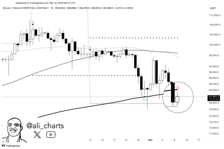 Bitcoin (BTC) has dropped 11.3% over the past week, currently trading in the low $80,000 range at the time of writing. The recent decline has pushed the leading cryptocurrency below the 200-day moving average (MA), raising concerns about a potential deeper pullback. Bitcoin Must Defend This Key Price Level According to an X post by seasoned crypto analyst Ali Martinez, BTC is now trading below the 200-day MA, a key price level that has historically functioned as a strong support for the top digital asset. Related Reading: Bitcoin Sellers Incur Loss As SOPR Drops To 0.95 – A Sign Of Market Bottom? For the uninitiated, the 200-day MA is a famous technical indicator that essentially represents the average closing price of BTC over the last 200 days to identify the long-term price trend. Historically, a sustained movement above the 200-day MA has led to long-term uptrends while a prolonged price movement below the level has often preceded further declines. Martinez stressed that BTC must remain above the TD Sequential indicator’s risk line at $79,280. He added that a sustained move above this level could set the stage for a strong rebound to the upside. The potential for a BTC recovery was echoed by fellow crypto analyst Ted. In a post on X, he pointed out that over the past two years, BTC has frequently undergone 25% to 30% corrections before rebounding to new all-time highs (ATHs). Ted noted: In 2023, BTC went from $30K to $22K. In 2024, BTC went from $74K to $50K. This year, BTC has dumped from $109K to $79K. We all know what happened after the last 2 major corrections. If BTC follows a similar pattern and climbs 30% from its current price, it could reach approximately $104,000 in a short period. However, broader macroeconomic factors – such as US President Donald Trump’s trade tariffs and the Federal Reserve’s (Fed) monetary policy – could significantly impact BTC’s trajectory. BTC Needs To Reclaim $84,000 First In another post on X, Martinez outlined BTC’s potential path to a new ATH, emphasizing that BTC must first reclaim $84,000 as a support level before any major upside movement. Once this milestone is secured, the digital asset could rally toward $128,000. Related Reading: Bitcoin Fills CME Gap Between $78,000 and $80,000 – Is A Reversal Around The Corner? Several indicators suggest that BTC may have already found a local bottom, increasing the chances of a trend reversal. Crypto analyst Rekt Capital recently noted that BTC’s plunge to $78,258 could mark the cycle low. Additionally, the US Dollar Index (DXY) has just recorded one of its largest weekly breakdowns since 2013, a move that historically signals bullish momentum for risk-on assets like BTC. At press time, BTC trades at $80,137, down 3.5% in the past 24 hours. Featured image from Unsplash, charts from X and TradingView.com