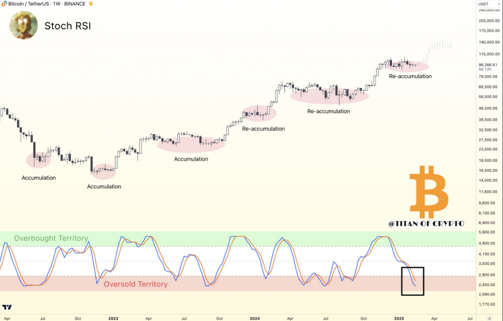Although traders are on edge due to the price behavior of Bitcoin, some analysts think a breakout is just around the corner. Related Reading: Think XRP Is ‘Crashing’? Analyst Says You Deserve A Slap! One of the vocal supporters of Bitcoin is “Titan of Crypto,” who suggests that Bitcoin’s stochastic relative strength index (StochRSI) is about to signal a major move. Could BTC be about to start a fresh climb as institutional interest grows and technical signals line up? Bitcoin: Strong Reversal From StochRSI Signals Titan of Crypto claims that the weekly StochRSI of Bitcoin is in oversold zone, a situation that has always preceded notable positive reversals. Measuring momentum, this indicator points to BTC maybe preparing for a push higher. The analyst said: “Bitcoin could be ‘about to take off.’” The top crypto is currently trading around $96,910, marking a 1.36% increase from the previous session. Showing indications of increasing volatility, the intraday range has varied from $95,400 to $97,300. Should the StochRSI trend follow, BTC could bounce back to higher levels. #Bitcoin About to Take Off? 🚀#BTC has entered oversold territory on the weekly Stoch RSI, a signal often marking accumulation or re-accumulation. pic.twitter.com/DHyEKXT31E — Titan of Crypto (@Washigorira) February 19, 2025 Institutional Demand Still Remains Strong Institutional engagement is one of the main elements showing great promise for Bitcoin. Well-known for its aggressive acquisition of the crypto, Strategy (previously MicroStrategy) has revealed intentions to purchase more Bitcoin by means of $2 billion raised via convertible notes. This action underscores mounting belief in the long-term value proposition of Bitcoin. Bitcoin ETFs, with total assets amounting to $120 billion, have garnered substantial inflows. Due to the popularity of these investment products, which has strengthened their standing in the financial markets, organisations now have easier access to the most widely utilized digital asset globally. BTCUSD trading at $96,980 on the 24-hour chart: TradingView.com Market Contradictions Raise Questions Despite hopeful signals, not everyone thinks Bitcoin will boom soon. Crypto stocks underperform conventional stocks, say some experts. BTC remains below its January peak, suggesting market uncertainty despite the S&P 500’s highs. Recent Bitcoin price swings indicate investor uncertainty. Despite positive macro indications, bitcoin has stalled, sparking some reservations regarding its next trajectory. Related Reading: 10x Dogecoin: The ‘Secret Window’ You Need To Know, According To This Analyst Bitcoin’s Next Move: Breakout Or Consolidation? Bitcoin’s future is still hotly debated given institutional investors’ ongoing curiosity and technical signals pointing to a probable breakout. Should previous trends hold, the market might be about to experience an extraordinary climb. Macroeconomic events and investor mood will eventually, however, decide whether BTC can maintain a breakout or keep trading sideways. Right now, everyone’s focused on the next technical confirmation for Bitcoin. Will the bulls take over, or will doubt help to control prices? For the biggest cryptocurrency in the world, the next weeks could be crucial. Featured image from Gemini Imagen, chart from TradingView
