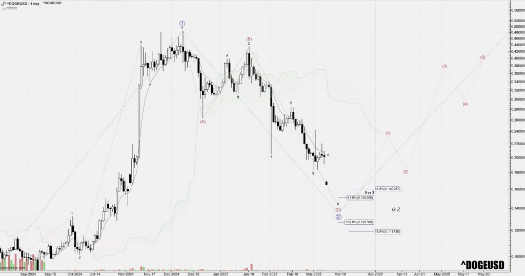 A recently published Dogecoin (DOGE) chart by analyst Paul (@Zig_ZagTrades) suggests that the popular meme-based cryptocurrency could slide as low as $0.12 in a final corrective phase before attempting a significant rebound. The 1-day chart, shared on X, outlines a textbook Elliott Wave structure that Paul interprets as a larger (A)–(B)–(C) correction, culminating in a potential Wave 2 near the $0.12–$0.15 region. More Downside For Dogecoin Ahead? In Paul’s analysis, Dogecoin has been tracing a five-subwave decline since reaching a prominent peak labeled as Wave 1 on his chart. This top coincided with a multi-day surge that lost momentum and reversed lower, leading to a series of smaller waves marked as 1, 2, 3, 4, and now 5. The analyst indicates that this fifth and final subwave is likely concluding a broader C wave (or 2nd wave if counting at a higher degree). Paul’s notations highlight a “GZ” (a “Golden Zone” commonly used by traders to pinpoint Fibonacci support clusters), and his markings pinpoint Fibonacci ratios that could define DOGE’s near-term floor. Related Reading: Buy Dogecoin Now? Analyst Says This Is the Spot The chart shows a cluster of key retracement levels spanning from $0.16 down to the mid-$0.11 range. Paul highlights Fibonacci levels at 61.8% around $0.160257 and $0.150508, alongside deeper retracements at 78.6% near $0.118726 and a 100% projection around $0.126709. These numeric zones appear to bracket the “GZ” in which Paul believes DOGE may complete its final subwave. According to the chart, the $0.12–$0.15 pocket stands out as the most critical price territory for bulls seeking to halt the ongoing downtrend. The path from the current price region toward this lower objective is labeled with a subwave count that suggests a final push beneath prior lows. Candlestick patterns on the chart confirm a sequence of lower highs and lower lows in recent weeks, a sign that the bearish momentum remains intact. Volume bars at the bottom indicate steady selling pressure accompanying downward impulses, in line with the view that DOGE could still be carving out its terminal leg of the correction. Related Reading: Dogecoin Analyst Predicts Massive Price Explosion—Is $6.24 Far-Fetched? Paul’s use of Ichimoku Cloud settings shows that the price has consistently traded below the cloud since late January, indicating that DOGE has yet to reestablish any bullish momentum. The shaded green cloud area on his chart appears to have acted as dynamic resistance, backing up the notion that the market has remained in a corrective posture for several weeks. The analyst’s labeling of the waves beyond the purported bottom, marked as (1) to (5), suggests an expectation of an eventual upward cycle if and when the coin finds support in the “GZ” zone. While the chart projects a subsequent rally from the anticipated low, no guarantees exist that DOGE will definitely hold the $0.12–$0.15 band. Failure to do so would theoretically extend the corrective pattern and undermine the bullish wave count, but Paul’s annotation implies that he sees the current downswing as a last flush of sellers. In his own words, “DOGE 1D: A Subwave 5 drop setting up a wave C/2 finish in the GZ for DOGE,” suggests an expectation of a local bottom in this area, although the market’s overall direction will hinge on whether enough buyers step in at those Fibonacci levels. At press time, DOGE traded at $0.17 Featured image created with DALL.E, chart from TradingView.com