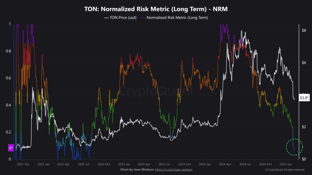 Toncoin (TON), which once saw significant hype leading to consistent new highs, has struggled to regain upward momentum. After a series of steady declines in the past week, the asset’s price has now slipped below the $4 mark, leaving investors concerned about its near-term potential. This prolonged downtrend has caused speculation about whether TON might be approaching a crucial turning point that could result in a major reversal in price. Related Reading: Is Toncoin Set for a Comeback? Key Market Signals Point to a Possible Rebound TON’s NMR Hits Rock Bottom: A Golden Opportunity for Investors? Amid the bearish trend, Joao Wedson, a contributor on CryptoQuant’s QuickTake Platform, recently highlighted some intriguing insights. In a recent post, titled “TON Reaches NMR Lows: A Signal for Medium- to Long-Term Accumulation,” Wedson explained that the Normalized Metric Risk (NMR) for TON has hit its lowest levels yet. This indicator assesses the asset’s valuation by comparing its current price against weighted moving averages, including 50-day and 374-day averages. By factoring in logarithmic differences and time-weighted adjustments, the NMR offers a deeper perspective on TON’s market standing. Wedson’s analysis suggests that TON’s current low valuation phase could present a potential opportunity for investors. According to his findings, the NMR’s historic low levels indicate that the token might be undervalued. TON Reaches NMR Lows: A Signal for Medium to Long-Term Accumulation “This indicator, which evaluates the relationship between the current price and weighted moving averages… reveals that the TON token is in a historically low valuation phase.” – By @joao_wedson pic.twitter.com/P8ckhnSFck — CryptoQuant.com (@cryptoquant_com) February 11, 2025 For those who adopt a medium- to long-term investment horizon, this may be an opportune moment to begin accumulating TON, with the expectation that its price will appreciate over time. However, it’s worth noting that such a strategy is not without risks. While historically low valuation metrics may hint at future growth, the broader market conditions and TON’s overall adoption will play critical roles in determining whether this approach pays off. Toncoin Price Performance And Outlook Meanwhile, Toncoin is currently trading at $3.78—this market price marks not only a 1.1% decline for Toncoin in the past 24 hours but also adds to the prolonged bearish trend in TON in recent weeks marking a 22.5% drop in TON price over the past two weeks. Notably, so far, TON has fallen roughly 54% from its all-time high of $8.25 registered in January last year. Interestingly, despite this bearishness, another CryptoQuant analyst known as Darkfost has highlighted a bullish indicator for TON. Related Reading: Toncoin Stabilizes Above $5: Is Now The Time To Buy TON? According to Darkfost, TON’s risk appetite has soared, “signaling an influx of liquidity into the TON ecosystem.” 🚨 Risk Appetite Soars Among $TON Speculators 💥 We are currently witnessing a historic high in risky investments, such as derivatives, options, and lending, on TonCoin. This suggests that speculative investors have increased their risk exposure to TON following the recent… pic.twitter.com/HCQ1va4VOV — Darkfost (@Darkfost_Coc) February 11, 2025 Featured image created with DALL-E, Chart from TradingView