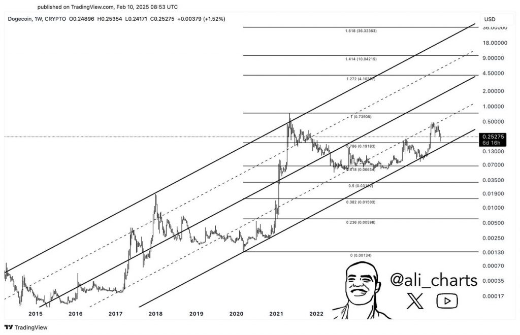 Crypto analyst Ali (@ali_charts) has published a weekly chart on TradingView that places Dogecoin (DOGE) squarely above a defining ascending channel drawn from early 2014. Although many altcoins have gone through boom‐and‐bust cycles in their histories, the attached chart reveals that DOGE has largely respected this upward‐sloping range for more than a decade. “DOGE is holding strong above the upper boundary of this channel, keeping the path open for a potential rally toward $4!” Martinez claims. Dogecoin Poised For $4? The channel itself is composed of two primary bold lines—defining the lower and upper ranges of price action—as well as a series of dashed mid‐channel lines. In 2014, Dogecoin lingered below $0.00017. Year later, in March 2020, Dogecoin fell to $0.00134, a level that corresponds to the 0% Fibonacci reference point on the chart. From there, price action began forming a gentle uptrend that has become clearer over time, punctuated by spikes in 2017–2018, a run in mid‐2019, and most notably the massive rally in 2021 when DOGE surged to a historical high of approximately $0.73905. Following a sharp retracement, price briefly consolidated near $0.06654, a zone marked by the 0.618 Fibonacci retracement. DOGE then built enough strength to climb above the 0.786 Fibonacci level around $0.19183, which coincided with the midpoint of the lower ascending channel. Related Reading: Whales Accumulate 100 Million Dogecoin In 24 Hours – Demand Signals Growing Confidence At present, Dogecoin sits near $0.25, placing it above the channel’s lower boundary but also below the dashed lower trendline that has consistently served as a reference for major breakouts. In April 2024 as well as in December 2024, DOGE was rejected at this trendline near $0.23 and $0.48 respectively. With the current correction, DOGE may have successfully completed a retest of the previous local high near $0.23 and is now ready for the next rise. Notably, periods when DOGE has gravitated around these dashed lines have often preceded large directional moves, both on the way up and on the way down. A break above the lower dashed line which currently sits near $0.50 could potentially trigger Dogecoin’s next major upside move. Overall, the overarching takeaway from Ali’s perspective is that Dogecoin remains structurally intact within this multi‐year trend, reinforcing the idea that future price expansions are possible. Fibonacci analysis featured on the chart shows multiple levels spaced throughout Dogecoin’s history. The 0.618 retracement at around $0.06654 stands out for having captured the lows of the 2022 bear market, while the 0.786 Fibonacci mark near $0.19183 served as a consolidation pivot before the current move higher. Related Reading: Is Dogecoin Massively Undervalued? Analyst Says ‘Now Is The Time’ Above the 1.0 extension (the 2021 all‐time high around $0.73905) lie key Fibonacci extension targets, namely 1.272 near $4.10, 1.414 around $10.04, and 1.618 near $36.32. These levels provide a technical roadmap for the most optimistic scenarios, though each one becomes progressively more speculative as price would need to shatter multiple psychological and technical barriers to reach them. By reclaiming and holding above the upper boundary of the channel, Dogecoin appears to be staging another potential expansion phase. Chart interpretations suggest that as long as DOGE remains above this threshold, it retains a bullish structure that has reliably channeled rising prices over the past decade. If, however, price were to fall back below $0.0.19, it could slip towards the lower boundary of the channel or possibly even break below it, thus destroying the bullish case for DOGE. At press time, DOGE traded at $0.26791. Featured image created with DALL.E, chart from TradingView.com