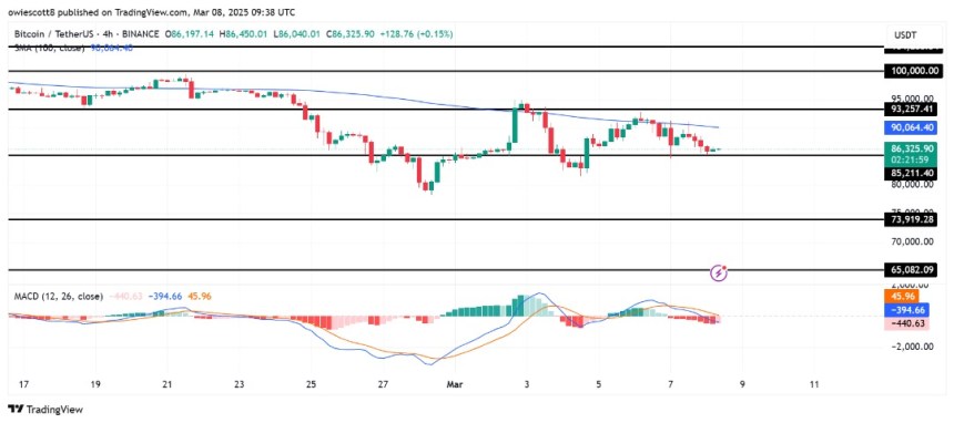 Bitcoin is making an effort to stage a comeback after dipping to $85,211, but a lack of strong momentum is casting doubt on the recovery. While buyers are attempting to regain control, technical indicators suggest that bullish strength remains fragile, raising concerns about whether BTC can sustain its rebound or face another pullback. With key resistance levels ahead and market sentiment still uncertain, Bitcoin’s next move remains unpredictable. If buyers fail to build enough momentum, BTC could struggle to push higher, leaving it vulnerable to renewed selling pressure. Bitcoin Tries To Bounce Back BTC’s current price action indicates that bulls are making an effort to stage a rebound from the $85,211 support level after a sharp decline. This attempt follows a period of strong bearish pressure, which intensified when Bitcoin faced heavy resistance at $93,257 and failed to move upward. Related Reading: Bitcoin Price Attempts a Comeback—Is a Recovery Rally on the Horizon? Despite some signs of stabilization, technical indicators suggest that bullish momentum remains weak. The lack of strong buying pressure raises concerns about whether BTC can maintain its current attempt at a rebound or if another downturn is imminent. Additionally, the price remains below the 100-day Simple Moving Average (SMA), signaling that bears still dominate the market. Furthermore, the MACD line and the signal line are edging lower, hinting at a possible decline in bullish momentum. If both lines continue downward and cross into negative territory, it could signal a shift in trend favoring the bears. This weakening performance suggests that buying pressure is not strong enough to sustain a meaningful recovery, increasing the risk of further downside. A confirmed bearish crossover might reinforce selling dominance, making it difficult for BTC to regain an uptrend. For the bulls to regain control, a surge in buying activity is needed to push the MACD indicators back into a positive trend. Traders should watch key support and resistance levels closely for confirmation of the next trend direction Potential Scenarios: Rebound Or Another Leg Down? If bulls successfully defend the $85,211 support level, Bitcoin could stage a relief rally, driving prices toward the immediate resistance at $93,257. A decisive break above this critical level could open the door for a stronger bullish push, propelling BTC toward $100,000. Such a move would restore market confidence and attract more buyers, increasing the likelihood of continued upside expansion. Related Reading: Bitcoin Reclaims $90K But This Indicator Signals Possible Consolidation Phase However, once Bitcoin fails to gain momentum, a drop below $85,211 may accelerate losses. In this case, BTC might test lower support levels, possibly around $73,919 or even $65,082, before finding stability. Featured image from Unsplash, chart from Tradingview.com