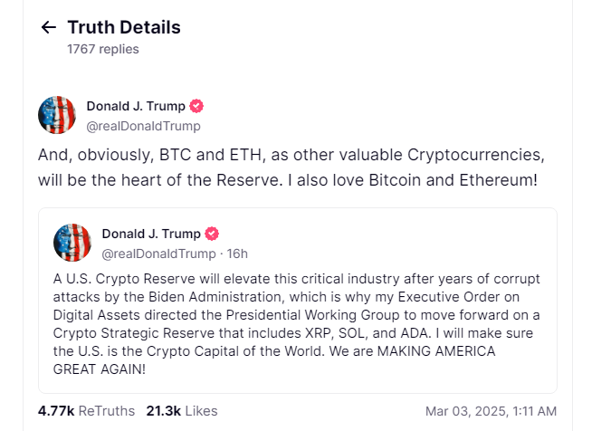 United States President Donald Trump has made yet another bold move in the crypto field. After earlier announcing plans to establish a strategic Bitcoin reserve, he now intends to include several additional digital assets. Related Reading: XRP Sky-High Target: Analyst Predicts $385 – Here’s The Case In a Truth Social post, Trump stated that the US should stockpile XRP (XRP), Solana (SOL), and Cardano (ADA). He also added Bitcoin (BTC) and Ethereum (ETH) to the list, saying these would be “at the heart of the reserve.” His most recent position has caused market responses and conversations over the potential effects on the nation’s adoption of cryptocurrencies. Trump’s Initial Bitcoin-Only Plan Changes At the Bitcoin 2024 meeting in Nashville, Tennessee, Trump first talked about his idea of a national Bitcoin reserve. He only talked about Bitcoin at the time and called it an asset of strategic value. His words were different from what he had said before, when he was critical of cryptocurrencies. Now, he has added more tokens to his vision, showing how important they are in the digital market. Listed Coins Rally After Trump Announcement Following Trump’s announcement, the cryptocurrency market experienced a price increase in the listed assets: SOL, ADA, and XRP were by up to 62%, while, Bitcoin and Ethereum also jumped by more than 10% apiece, Sunday. President Trump Announces U.S. Crypto Reserve, Adding Bitcoin, Ethereum, Solana, XRP, and Cardano President Donald Trump has announced the creation of a U.S. crypto strategic reserve, directing the President’s Working Group on Digital Assets to include XRP, Solana (SOL), and… — BRICS News (@BRICSinfo) March 2, 2025 No Clear Plan For Implementation? While the idea of a US crypto reserve is gaining attention, details on how it would be structured remain vague. The President’s Working Group on Digital Assets, which Trump directed to explore the plan, has not yet laid out any guidelines. There are no specifics on whether the government would buy these assets directly, regulate them differently, or simply acknowledge them as key financial instruments. The 1st White House Crypto Summit On March 7, Trump will host the inaugural White House Crypto Summit with industry executives and the Digital Asset Working Group to discuss US crypto regulation. The conference will address running a national cryptocurrency reserve, monetary policy, and market manipulation protections. Related Reading: Solana Jumps 9% As Whales Quietly Accumulate Millions—Details What Comes Next For Crypto Under Trump With Trump at the helm, his administration’s stance on crypto could shape the industry’s future in the US. Unlike past administrations, which have often been doubtful or clearly hostile toward digital assets, his most recent comments suggest to a more open posture. This could lead to changes in policy impacting taxes, trade, and rules. Although it’s unknown exactly when real action will follow Trump’s disclosure, right now the market is responding. Should his administration follow these ideas, the government’s attitude toward cryptocurrencies would drastically shift. Featured image from Gemini Imagen, chart from TradingView