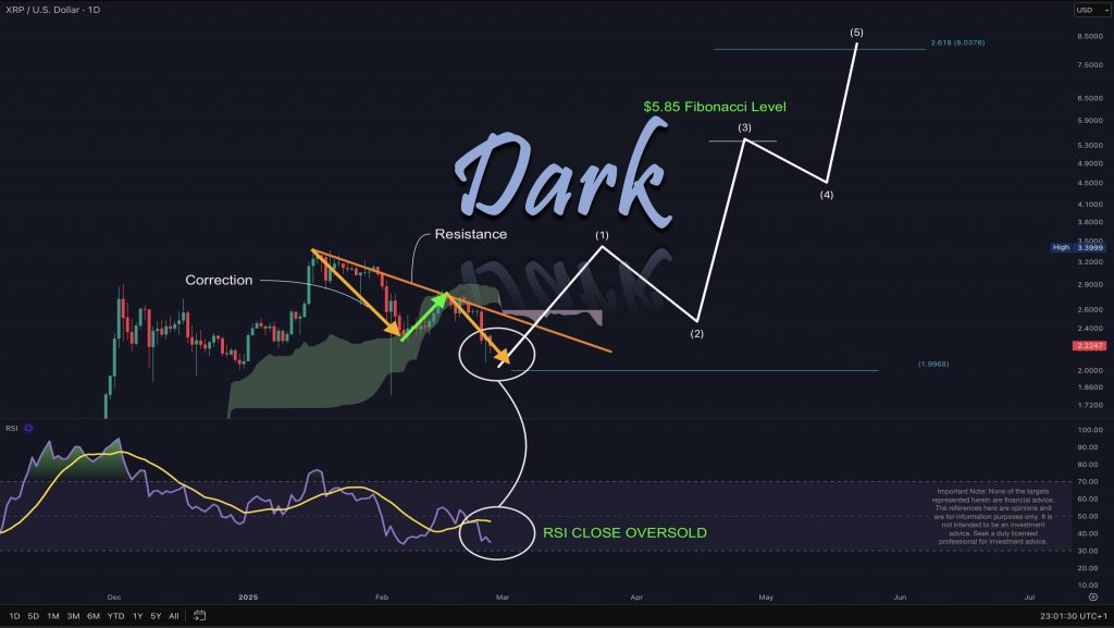 In line with the broader market trend, the XRP price is down almost -35% since its mid-January peak at $3.40, but according to analyst Dark Defender (@DefendDark), the downward trend may soon reach its conclusion. In his latest technical analysis, he highlights that XRP is finalizing an ABC correction pattern on the daily timeframe, supported by the fact that the Relative Strength Index (RSI) is approaching oversold conditions. This could indicate an imminent trend reversal leading to a new bullish wave structure. The ABC correction is a standard pattern in Elliott Wave Theory, representing a three-wave corrective movement that follows an impulsive rally. Wave A typically initiates the first decline, Wave B sees a temporary rebound, and Wave C marks the final leg down, often establishing a significant bottom. In XRP’s case, Dark Defender’s chart suggests that Wave C is nearing completion, meaning the asset may soon be ready for a new impulsive upward trend. Where Is The XRP Price Heading Next? From a technical perspective, XRP is approaching key support levels between $1.88 and $1.91, which could act as a strong foundation for a reversal. If price action confirms a bottom around this area, the next phase could involve a bullish breakout targeting several important resistance levels. The first key resistance sits at $2.44, which would need to be broken to confirm a shift in trend. Above that, the $2.99 zone becomes a critical hurdle before a potential rally toward $5.85, a level aligned with Fibonacci extensions. Related Reading: XRP Price Continuation After Crash Below $2.4? New Targets Emerge Looking at additional indicators, the RSI on the daily timeframe is nearing oversold conditions, a historically reliable signal that suggests selling momentum may soon exhaust itself. A sharp rebound from this area would reinforce the case for a bullish reversal. Furthermore, the chart shows that XRP has been forming a descending wedge pattern, a structure that is commonly associated with breakouts to the upside. A decisive move above the wedge’s resistance trendline could provide the necessary confirmation for the start of a new Elliott Wave cycle. Dark Defender projects that, once the correction phase is complete, XRP could begin a five-wave impulsive structure targeting a move toward $3.00 in Wave 1, followed by a brief pullback before an extended rally toward $5.00 – $5.85 in Wave 3. Subsequent consolidation in Wave 4 would then set up a final surge toward $8.00 in Wave 5, aligning with the 2.618 Fibonacci level as a potential long-term target. Related Reading: XRP Breaks Down Below Key Demand – Analyst Expects A Drop To $1.65 For traders watching XRP’s price action, the $2.44 and $2.99 resistance levels will be critical. A breakout above these zones would confirm the start of a bullish uptrend, while failure to hold the $1.88 – $1.91 support range could signal further downside risk. With momentum indicators pointing toward exhaustion in selling pressure, a reversal seems increasingly probable, making this an important period for XRP’s market structure. “XRP is close to finalising the ABC correction pattern in the daily time frame, considering the lowest RSI figures. RSI is close to the oversold area. The expected first wave will be towards $3, and our aim will be between $5 and $8, with Wave 3-5,” Dark Defender concludes. At press time, XRP traded at $2.21. Featured image created with DALL.E, chart from TradingView.com