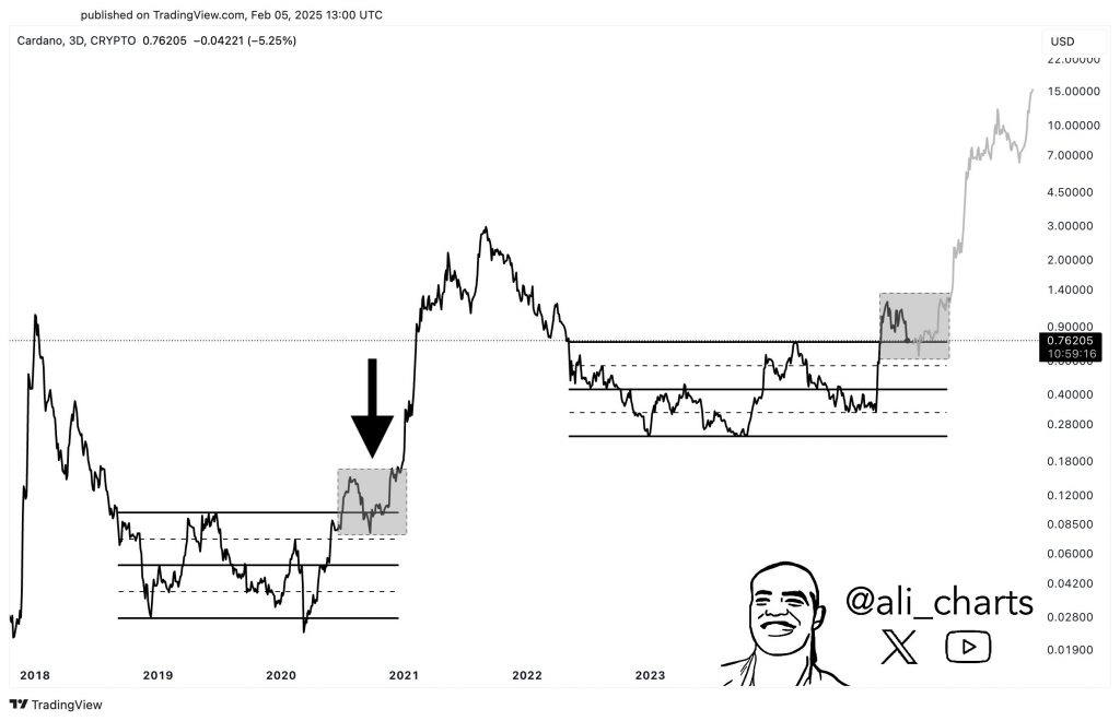 A new analysis by crypto strategist Ali Martinez suggests that Cardano (ADA) might be on the cusp of a significant upward move—potentially reaching the $15 price mark, which would represent a staggering 1,850% rally from current levels near $0.76. “If historical data is any guide, Cardano could be at the very beginning of a monster parabolic rally!” Martinez writes via X. Cardano Fractal Analysis Points To Major Upside Martinez’s chart (published on the 3-day timeframe) draws a parallel between Cardano’s price action in the 2018–2021 cycle and its present structure, highlighting a near-identical fractal pattern. In the previous cycle, ADA consolidated for several months within a defined horizontal range before staging a decisive breakout and retest of the upper boundary. That retest then led to a parabolic ascent spanning late 2020 into 2021. In the current cycle, Cardano appears to be retesting a similar support line, shown on Martinez’s chart as a horizontal band around $0.76–$0.80. If ADA were to follow the same trajectory that transpired in its last major rally, Martinez’s “monster parabolic rally” fractal implies a surge toward $15. Related Reading: Cardano Price Breaks Down From Ascending Channel, Here Are Two Ways It Could Go Immediate Support is currently at $0.76–$0.80. According to the chart, ADA is hovering just above a critical support zone—its role in the previous cycle was to provide a springboard for the bull run that followed. The next significant resistance level is around $1.60, aligning with the upper boundary of the grey-highlighted zone on the chart. Notably this price level also aligns with the 0.5 Fibonacci retracement level drawn from the last bull market peak to the bear market bottom. In the long term, the grey extended price line in Martinez’s chart illustrates the fractal-based projection, indicating that ADA could ultimately surge toward the $15 region. If ADA continues to follow this trajectory, the area between the 0.618 Fibonacci level ($2.00) and the 0.786 Fibonacci level ($2.47) could act as a temporary resistance zone, potentially causing a brief consolidation before the rally resumes its upward momentum. Related Reading: Cardano Consolidates Within A Symmetrical Triangle – Expert Sees A 40% Move Once It Breaks Martinez’s view hinges on the idea that crypto markets often exhibit cyclical behaviors. In Cardano’s last major cycle, once a key horizontal level was reclaimed and successfully retested, momentum accelerated sharply, culminating in an explosive move. With the current market once again retesting a crucial support zone, Martinez posits that the table is set for another extended bull phase. Of course, fractals are not guarantees of future performance; rather, they are visual aids that highlight how price structures can echo past market behavior. Whether Cardano follows this script depends on broader market conditions and investor sentiment. Still, the analyst’s forecast underscores why $0.76 is a level to watch. At press time, ADA traded at $0.74. Featured image from Shutterstock, chart from TradingView.com