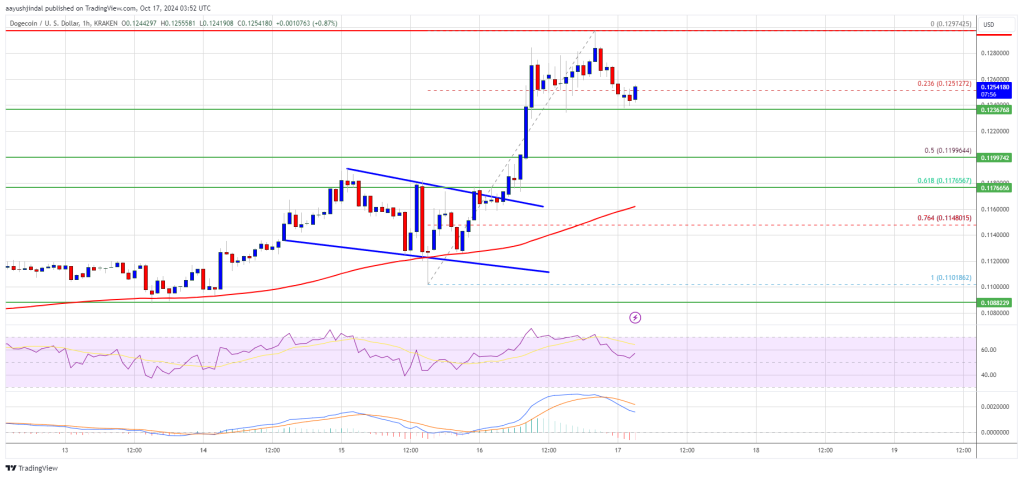 Dogecoin is rising above the $0.120 resistance zone against the US Dollar. DOGE is now showing positive signs and might clear the $0.1280 resistance. DOGE price started a fresh increase above the $0.1200 resistance level. The price is trading above the $0.1220 level and the 100-hourly simple moving average. There was a break above a major declining channel with resistance at $0.1170 on the hourly chart of the DOGE/USD pair (data source from Kraken). The price could gain bullish momentum if it clears the $0.1250 and $0.1280 resistance levels. Dogecoin Price Regains Traction Dogecoin price started a fresh increase above the $0.1100 resistance zone. DOGE gained traction for a move above the $0.1200 resistance zone, beating Bitcoin and Ethereum. There was also a move above the $0.1250 and $0.1265 resistance levels. During the increase, there was a break above a major declining channel with resistance at $0.1170 on the hourly chart of the DOGE/USD pair. The pair traded as high as $0.1297 and recently saw a minor downside correction. The price dipped below the $0.1265 level. It traded below the 23.6% Fib retracement level of the upward move from the $0.1101 swing low to the $0.1297 high. Dogecoin price is now trading above the $0.1200 level and the 100-hourly simple moving average. Immediate resistance on the upside is near the $0.1280 level. The next major resistance is near the $0.1300 level. A close above the $0.1300 resistance might send the price toward the $0.1320 resistance. Any more gains might send the price toward the $0.1350 level. The next major stop for the bulls might be $0.1400. Are Dips Supported In DOGE? If DOGE’s price fails to climb above the $0.1280 level, it could start another decline. Initial support on the downside is near the $0.1235 level. The next major support is near the $0.1200 level and the 50% Fib retracement level of the upward move from the $0.1101 swing low to the $0.1297 high. The main support sits at $0.1175. If there is a downside break below the $0.1175 support, the price could decline further. In the stated case, the price might decline toward the $0.1150 level or even $0.1120 in the near term. Technical Indicators Hourly MACD – The MACD for DOGE/USD is now gaining momentum in the bullish zone. Hourly RSI (Relative Strength Index) – The RSI for DOGE/USD is now above the 50 level. Major Support Levels – $0.1235 and $0.1200. Major Resistance Levels – $0.1280 and $0.1300.
