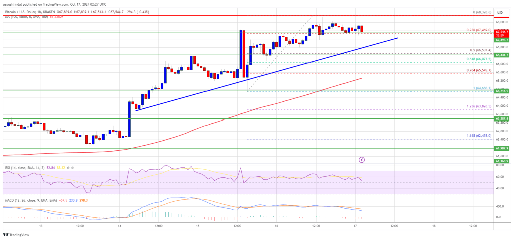 Bitcoin price climbed further higher above the $67,500 resistance zone. BTC is now consolidating and might clear the $68,350 resistance to continue higher. Bitcoin remained stable and extended gains above the $68,000 zone. The price is trading above $67,200 and the 100 hourly Simple moving average. There is a connecting bullish trend line forming with support at $66,800 on the hourly chart of the BTC/USD pair (data feed from Kraken). The pair could rally further if there is a close above the $68,000 resistance zone. Bitcoin Price Remains Supported for More Upsides Bitcoin price remained supported and extended its increase above the $67,500 resistance. BTC cleared the $67,800 resistance to move into a positive zone. The price even rallied above the $68,000 and $68,200 resistance levels. The price traded as high as $68,328 and currently consolidating gains. There was a minor decline below the $68,000 level. The price dipped and tested the 23.6% Fib retracement level of the upward move from the $64,686 swing low to the $68,328 high. Bitcoin price is now trading above $67,200 and the 100 hourly Simple moving average. There is also a connecting bullish trend line forming with support at $66,800 on the hourly chart of the BTC/USD pair. On the upside, the price could face resistance near the $68,000 level. The first key resistance is near the $68,350 level. A clear move above the $68,350 resistance might send the price higher. The next key resistance could be $68,800. A close above the $68,800 resistance might initiate more gains. In the stated case, the price could rise and test the $70,0200 resistance level. Any more gains might send the price toward the $72,000 resistance level. Another Drop In BTC? If Bitcoin fails to rise above the $68,000 resistance zone, it could start another decline. Immediate support on the downside is near the $66,800 level and the trend line. The first major support is near the $66,500 level and the 50% Fib retracement level of the upward move from the $64,686 swing low to the $68,328 high. The next support is now near the $66,500 zone. Any more losses might send the price toward the $65,400 support in the near term. Technical indicators: Hourly MACD – The MACD is now losing pace in the bullish zone. Hourly RSI (Relative Strength Index) – The RSI for BTC/USD is now above the 50 level. Major Support Levels – $66,800, followed by $65,400. Major Resistance Levels – $68,000, and $68,350.