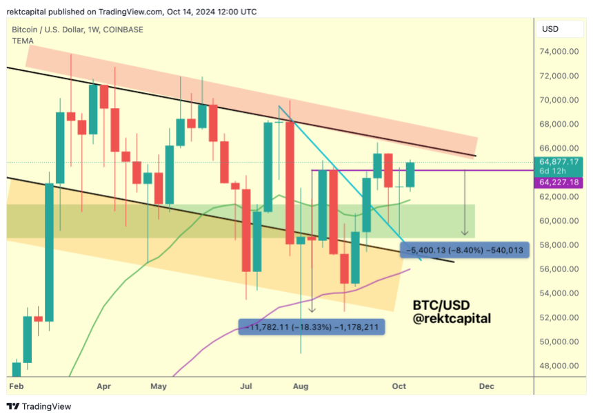 Bitcoin (BTC), the largest cryptocurrency by market capitalization, started the third week of October with a 6% daily surge. BTC’s performance has fueled bullish sentiment among crypto investors and market watchers, who suggest it might be ready to move to $70,000. Related Reading: Why Isn’t XRP Price Moving? Crypto Pundit Claims The Answer Bitcoin Reclaims Key Support Levels Bitcoin began the week reclaiming key resistance levels after a 6% surge from Sunday’s price. This performance saw BTC move from the $62,000 support zone to retest the $66,000 support area on Monday morning. Following the recent performance, Bitcoin’s October returns so far have turned green with a 3.17% monthly return, according to Coinglass data. Crypto analyst Rekt Capital highlighted Bitcoin’s recent movements, noting that BTC has been able to reclaim a 2-month downtrend as support. Per the analyst, the flagship cryptocurrency has retested a downtrend line dating back to late July since October started. BTC successfully retested and bounced from the trendline for two consecutive weeks, turning the range into support. Additionally, the analyst pointed out that Bitcoin has performed several successful retests, including a “volatile retest” of the 21-week Bull Market Exponential Moving Average (EMA). “Notice how the bottom of the green boxed area is confluent with the July Downtrend retest and the retest of the 21-week EMA is confluent with the top of the green box,” the analyst added. Similarly, Ali Martinez highlighted that BTC is currently making another attempt to reclaim the 200-day Moving Average after four consecutive rejections in the past two months. BTC Challenges August Highs Rekt Capital noted that BTC has solidified the $58,000-$61,000 range as a support area throughout the year: “It has done so at a Higher Low compared to last month’s downside wicking lows as well as August’s downside wicking lows.” Moreover, the analyst stated that Bitcoin challenged August highs, at around $64,200, after the recent retests of the key levels. He suggested that BTC’s recent movements are a “clear sign” that August’s level is “weakening as resistance.” Rekt Capital pointed out BTC is retesting the multi-month weekly downtrend channel top, which is also weakening as resistance. The flagship cryptocurrency successfully tested the channel’s range lows as support this month. The range lows have been 7-month confluent support with the previous all-time high (ATH) area. Nonetheless, the analyst noted that BTC must have a weekly close above the downtrend channel’s top to break out of this pattern. A weekly close above August highs, followed by a successful retest of this level, would “pose a significant buy-side pressure on the Downtrending Channel Top,” which could be accelerated if BTC’s daily close sits above $64,200. Related Reading: WIF Bulls Charge Toward $2.89 As Key Resistance Test Looms Moreover, a daily close above $65,000 and a successful reclaim of the range as a support zone could send BTC’s price toward the $70,000 resistance zone. The analyst noted that whenever Bitcoin closed the day above this level, the cryptocurrency moved within the $65,000-$71,350 range in the following days. As of this writing, BTC is trading at $65,812, a 4% and 10.3% surge in the weekly and monthly timeframes. Featured Image from Unsplash.com, Chart from TradingView.com