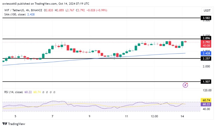 Recent trading activity reveals that WIF is gaining bullish momentum, with its price surging toward the critical $2.89 resistance level. After a brief pullback, buyers are stepping in, driving the asset higher and setting the stage for a potential breakout. A successful break could open the door to new gains, further reinforcing the positive sentiment in the market. As the price approaches this crucial level, the goal of this analysis is to determine whether WIF can sustain its upward strength and break through the $2.89 resistance. By evaluating key technical indicators, price trends, and market sentiment, this review will delve into the possible outcomes of this pivotal test, assessing the likelihood of either a continued rally or a possible pullback. Current Price Momentum: WIF Push Toward $2.89 WIF is exhibiting strong bullish momentum following a recovery from the $2.6 support level. By consistently trading above the 100-day Simple Moving Average (SMA), the cryptocurrency indicates that buyers are firmly in control, reflecting a strengthening trend. Maintaining this position could enhance optimistic sentiment and generate the push necessary to challenge higher resistance levels, particularly the $2.89 mark. An analysis of the 4-hour Relative Strength Index (RSI) indicates a renewed upbeat potential, with the RSI climbing back to 62% after dipping to 50%. If the RSI continues to rise, it could point to further gains for WIF, as the asset regains strength and attracts more bullish traders aiming to push the price toward key resistance zones. Related Reading: WIF Bulls In Control As RSI Signals Strong Upside Potential Furthermore, the daily chart indicates that WIF is under significant upward pressure, marked by a bullish candlestick formation after rebounding from $2.6 and trading above the 100-day SMA. This suggests strong buyer activity, positioning the meme coin to challenge the critical resistance level of $2.89. Also, the RSI on the daily chart currently stands at 66%, comfortably above the 50% threshold, indicating a positive shift in momentum for WIF. A sustained position above 50% generally signifies that buyers are in control. If this pressure continues, it could lead to more price appreciation as traders remain optimistic about the asset’s potential to break through key resistance levels. Potential Outcomes: Rally Continuation Or Pullback? A continuation of the current rally could see WIF breaking above the $2.89 resistance, paving the way for further gains and possibly reaching new highs. This scenario is supported by the positive momentum indicated by the RSI and the price’s position above the 100-day Simple Moving Average. Related Reading: Is DogWifHat (WIF) The “Most Bearish” Of All Major Meme Coins? Should WIF fail to break through the $2.89 resistance, it could face a pullback toward the $2.2 support level. A drop below this support would raise doubts about the sustainability of the current upward movement, potentially triggering a more significant decline toward the $1.5 support level. Featured image from LinkedIn, chart from Tradingview.com