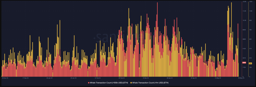 The past few months have seen Ethereum whales, the cryptocurrency world’s Goliaths, flexing their financial muscles. According to a recent report by Santiment, on-chain data reveals a surge in whale activity, possibly fueled by the green light for spot Ethereum exchange-traded funds (ETFs) from the US Securities and Exchange Commission (SEC). This heightened involvement from large investors adds an additional layer of intrigue to Ethereum’s bullish momentum, suggesting growing confidence and anticipation within the market. Related Reading: Time To Stack Stellar (XLM)? Analyst Calls For Epic 500% Price Breakout A Whale Of A Time: Accumulation Anchors Ahead The SEC’s surprise approval on May 23rd of 19b-4 forms for ETF applications from heavyweights like BlackRock and Fidelity stirred the cryptoverse nest. This long-awaited decision, following months of radio silence from regulators, seems to have been the harbinger of a buying spree for Ethereum’s biggest players. Santiment’s report dives deep, revealing a nearly 30% increase in holdings by wallets containing at least 10,000 ETH over the past 14 months. This translates to a staggering 21 million ETH, currently valued at a cool $83 billion, scooped up by these deep-pocketed investors. With Ethereum even surpassing Bitcoin in terms of percentage gains last month, it’s no surprise that the accumulation party shows no signs of stopping. Profit Feast Before The Main Course? The data suggests a recent uptick in whale transactions exceeding $100,000 and a whopping $1 million, reaching year-to-date highs after the ETF approval. This surge in activity could be interpreted as whales taking advantage of the bullish sentiment to lock in some profits. However, Santiment suggests this might be a strategic pit stop before diving back into the buying pool. As long as these “10K+ ETH wallets are still moving north,” the report argues, Ethereum’s price has the potential to continue outperforming its bigger brother, Bitcoin, even amidst market volatility. Profitable Seas For Ethereum Sailors The good news extends beyond whale activity. An analysis by NewsBTC revealed a positive trend in daily Ethereum transactions. Measured over a seven-day moving average, the ratio of profitable transactions to those ending in a loss sits at a healthy 1.87. This indicates that for every losing trade, there are nearly two winning ones, suggesting a wave of optimism among Ethereum investors. Ethereum Price Prediction Meanwhile, the predicted yearly low Ethereum price projection for 2025 is $ 3,716, based on the historical price patterns of Ethereum and the BTC halving phases. According to predictions, Ethereum’s price could rise to $6,722 in the upcoming year. Related Reading: Dogwifhat Unstoppable: Bullish Sentiment To Propel WIF Towards $6.7 – Analyst At the moment, the price projection for Ethereum in 2025 ranges from $3,716 on the low end to $6,722 on the high side. If ETH hits the higher price objective, Ethereum’s value might increase by 80% by 2025 compared to its current value. Ethereum has surged by 100% over the past year, outpacing 50% of the top 100 crypto assets. Trading above its 200-day simple moving average, it exhibits a bullish momentum, supported by 17 green days in the last 30, representing 57% of recent trading sessions. This performance underscores Ethereum’s resilience and attractiveness to investors, bolstered by its high liquidity and negative yearly inflation rate of -0.24%, signaling potential scarcity and value appreciation. Featured image from Klook, chart from TradingView