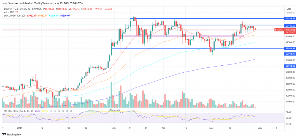 Recent analytical insights from FireCharts 2.0 are indicating significant maneuvers by major stakeholders of Bitcoin—often referred to as “whales”—which are impacting the cryptocurrency’s price movements. These stakeholders are altering liquidity patterns in a manner that suggests a strategic push towards a more tightly controlled trading range. What Bitcoin Whales Are Up To According to Material Indicators, an advanced trading analytics, there has been a noticeable adjustment in the distribution of liquidity within Bitcoin’s order book. Specifically, there is a decrease in ask liquidity at higher price points, coupled with an increase in bid liquidity starting from $60,000 to $67,000. This dynamic is set to compress Bitcoin’s price into a narrower range, a scenario anticipated by the platform since the digital asset escalated above $52,000. The discussions about Bitcoin’s price trajectory have been rife with speculation about a potential pump to $73,000, especially following its bounce from a low of $52,000. Despite a recent high near $70,600, which ended in a sharp rejection, the sentiment remains cautiously optimistic. “There has been a lot of chatter since late last week calling for a pump to $73k, and there are legitimate reasons why that is a near term target, and why it is still possible despite the rejection from $70.6k we saw on Monday,” noted Material Indicators. Related Reading: Is Mt. Gox A Worry For Bitcoin? Crypto Analyst Weighs In From a macroeconomic perspective, Bitcoin’s prospects appear exceedingly bullish. “The outlook for Bitcoin is literally as bullish as it’s ever been,” said a representative from Material Indicators during a recent livestream. They refrained from reiterating the specifics, urging viewers to revisit the previous week’s analysis for a deeper understanding. In contrast, the technical analysis paints a more nuanced picture. Despite the favorable macro outlook, Bitcoin has continuously failed to confirm a resistance/support (R/S) flip at $69,000—a crucial level for confirming bullish momentum. This ongoing failure is emblematic of the bulls’ struggle to maintain upward pressure and secure a new all-time high (ATH). By integrating order book data with technical indicators, analysts have observed a progressive downward movement in blocks of ask liquidity, from initial placements around $75,000-$76,000 to recent figures near $70,000-$71,500. Looking forward, the pivotal question is: how low can Bitcoin realistically go before finding substantial support? To address this, analysts at Material Indicators turn to a combination of technical analysis and real-time order book data. The convergence of Bitcoin’s 21-Day, 50-Day, and 100-Day Moving Averages around $65,000-$66,000 offers a compelling case for potential support. The 21-Day MA, in particular, is favored for its historical reliability as both resistance and support. Related Reading: Why The Bitcoin Halving Is Not Priced In And What’s Next: Expert Order book data corroborates this analysis, showing a strengthening of ask liquidity resistance above $70,000, while bid liquidity is strategically placed down to as low as $58,000. The largest concentrations of bid liquidity indicate the strongest support at $60,000 and $65,000, with somewhat lesser support around $66,000 and $67,000. Despite the complex interplay of factors in the near term, the long-term perspective remains overwhelmingly bullish. The essential query for the market is when, not if, a legitimate breakout will take place. Observations from the order book show more than $200 million in asks stacked from $71,000 to $75,000, juxtaposed with around $90 million in bids between $65,000 and $67,000. If ask liquidity does not thin out, bid liquidity will need to strengthen significantly to trigger a sustainable break into the $70s. According to Material Indicators, the most favorable scenario would see Bitcoin establish a firm consolidation range above $65,000, validate an R/S Flip at $69,000, and stabilize above this level before aiming for a new ATH. Such a development would not only confirm the bullish trend but also pave the way for sustained upward momentum based on the current order book trends and technical analyses. This trajectory, they suggest, would provide the healthiest market progression in light of the existing conditions. At press time, BTC traded at $67,832. Featured image created with DALL·E, chart from TradingView.com